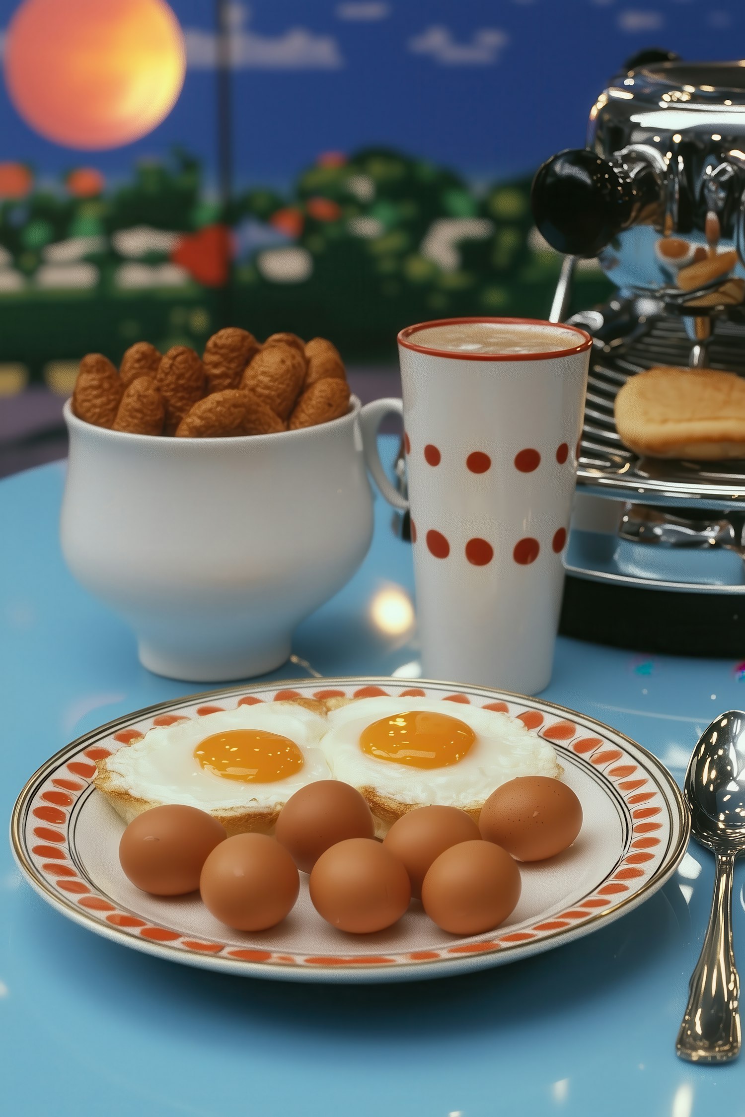 Colorful breakfast scene with eggs, pastries, and coffee on a blue table. Bright and inviting with a modern espresso machine.
