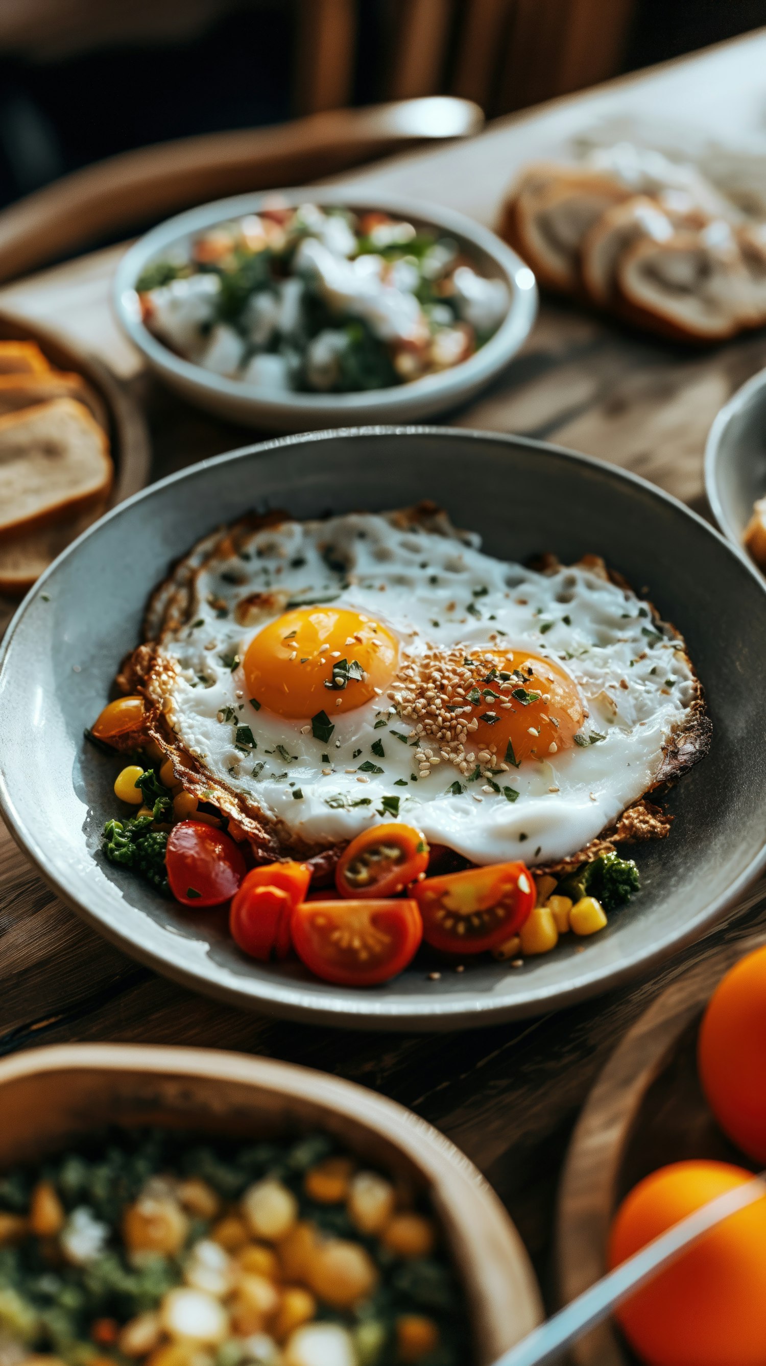 Sunny-side-up eggs with cherry tomatoes, corn, and greens on a rustic table, surrounded by salad and bread for a cozy breakfast.