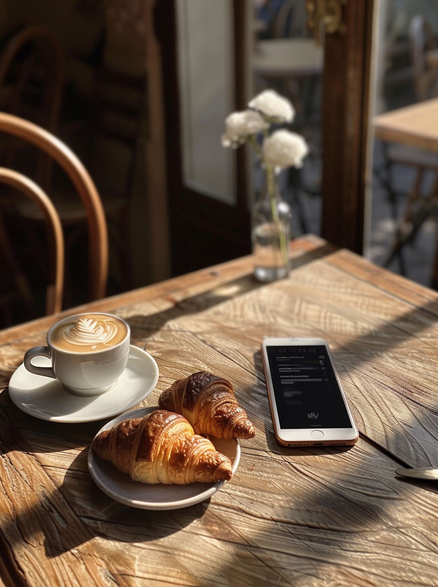 Cozy café scene with cappuccino, croissants, and a smartphone on a sunlit wooden table, accented by white flowers in a vase.