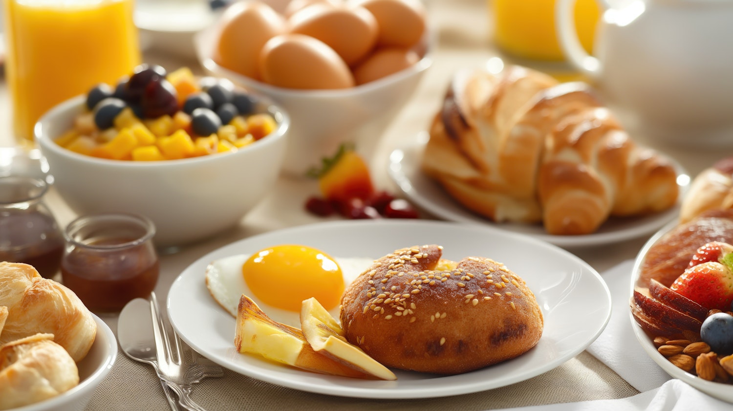 Delicious breakfast spread with eggs, croissants, fresh fruit, and orange juice, perfect for a vibrant morning start.