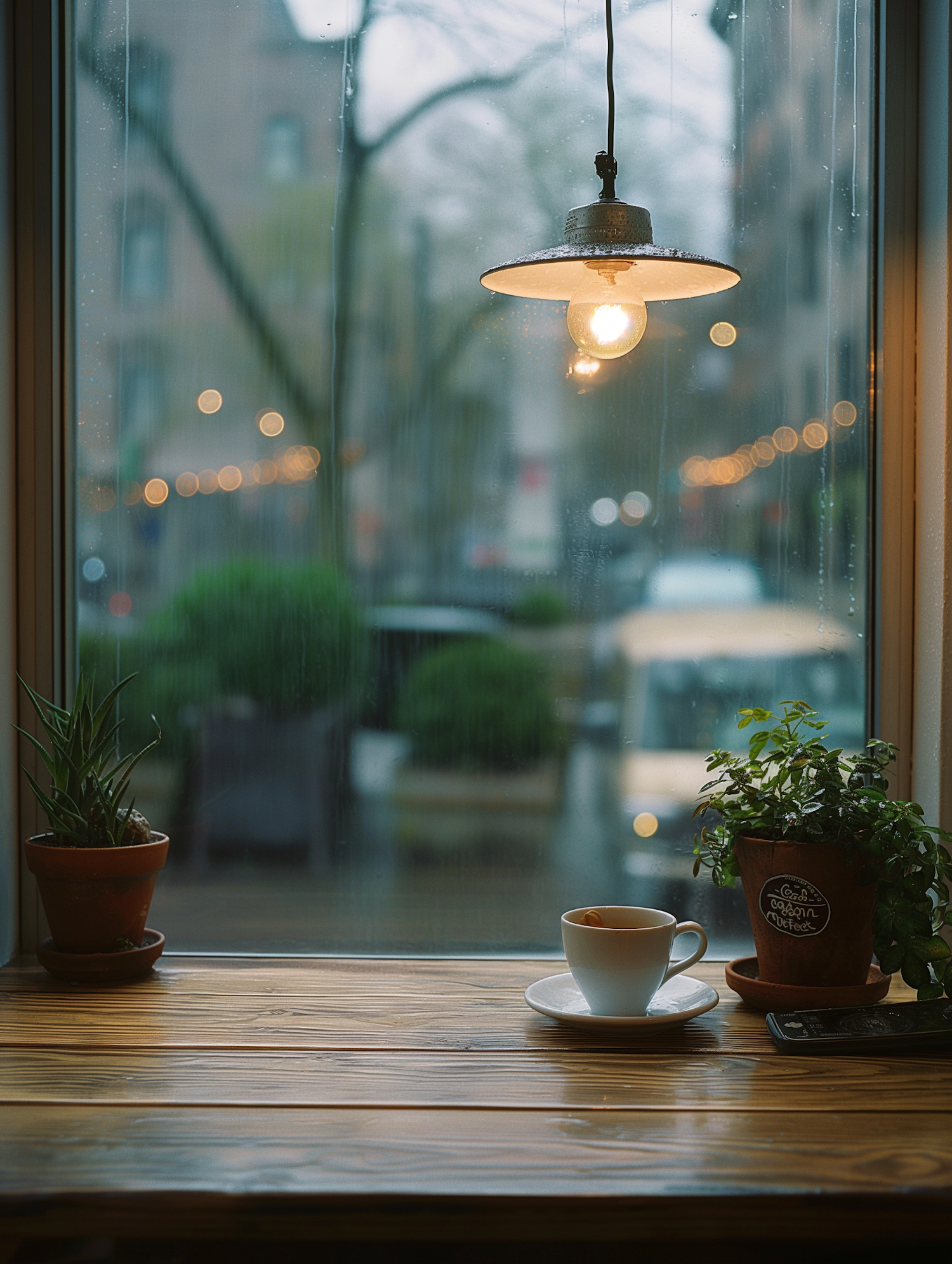 Cozy rainy day scene with a warm light, coffee cup, and plants by a window. Perfect for a serene, reflective moment.
