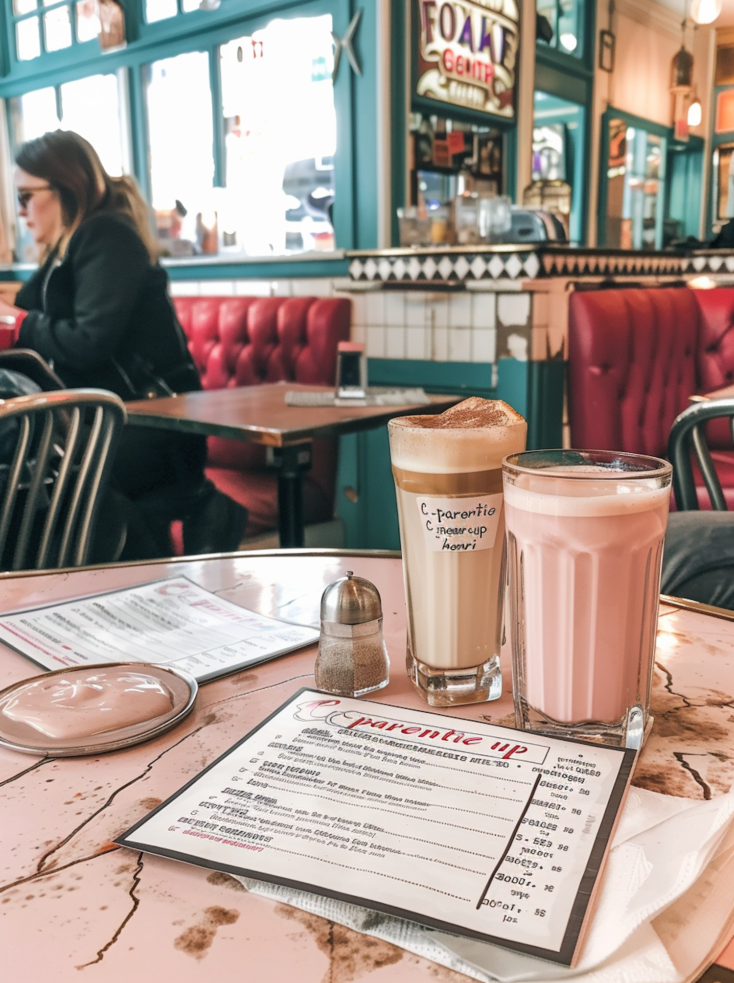Cozy café scene with latte, milkshake, and menu on a pink table. Vintage decor and a woman in the background add charm.