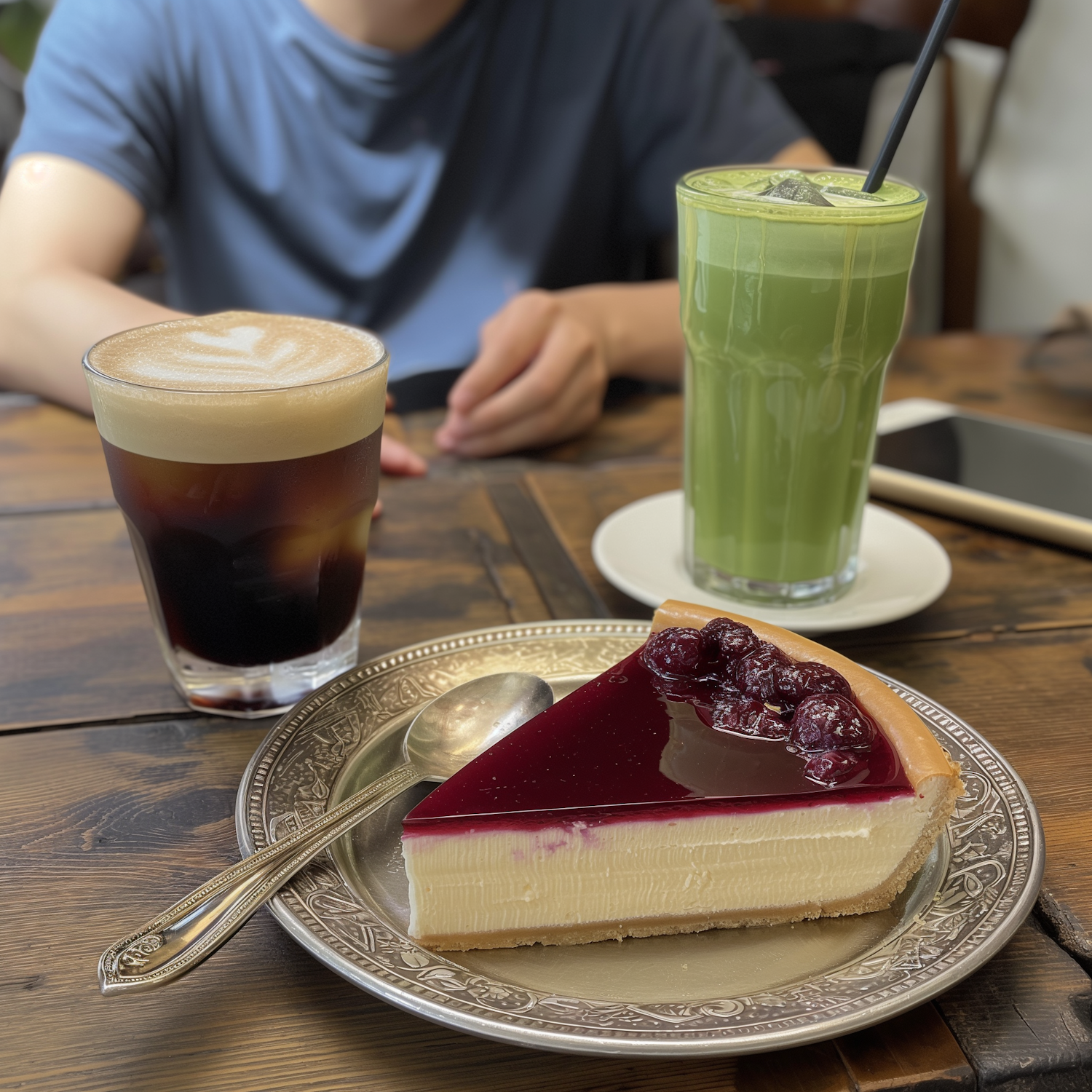 Cheesecake with cherry topping, iced coffee, and matcha latte on a rustic table. Casual dining ambiance with a person in a blue shirt.