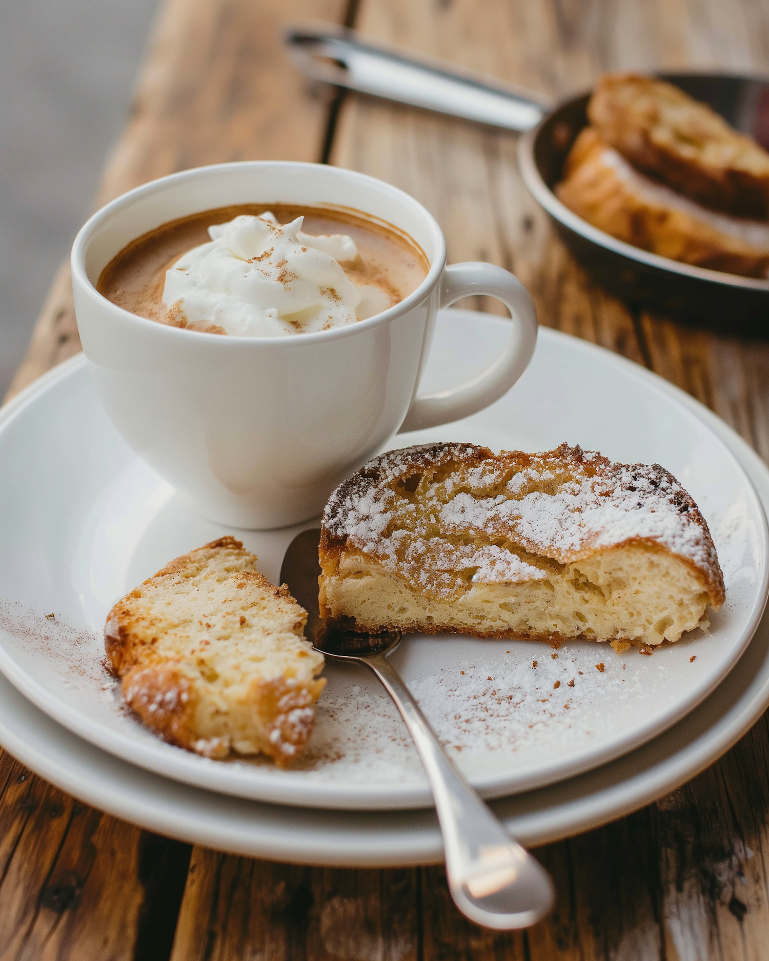 Cozy breakfast with hot chocolate and cake on a rustic wooden table, topped with whipped cream and powdered sugar.