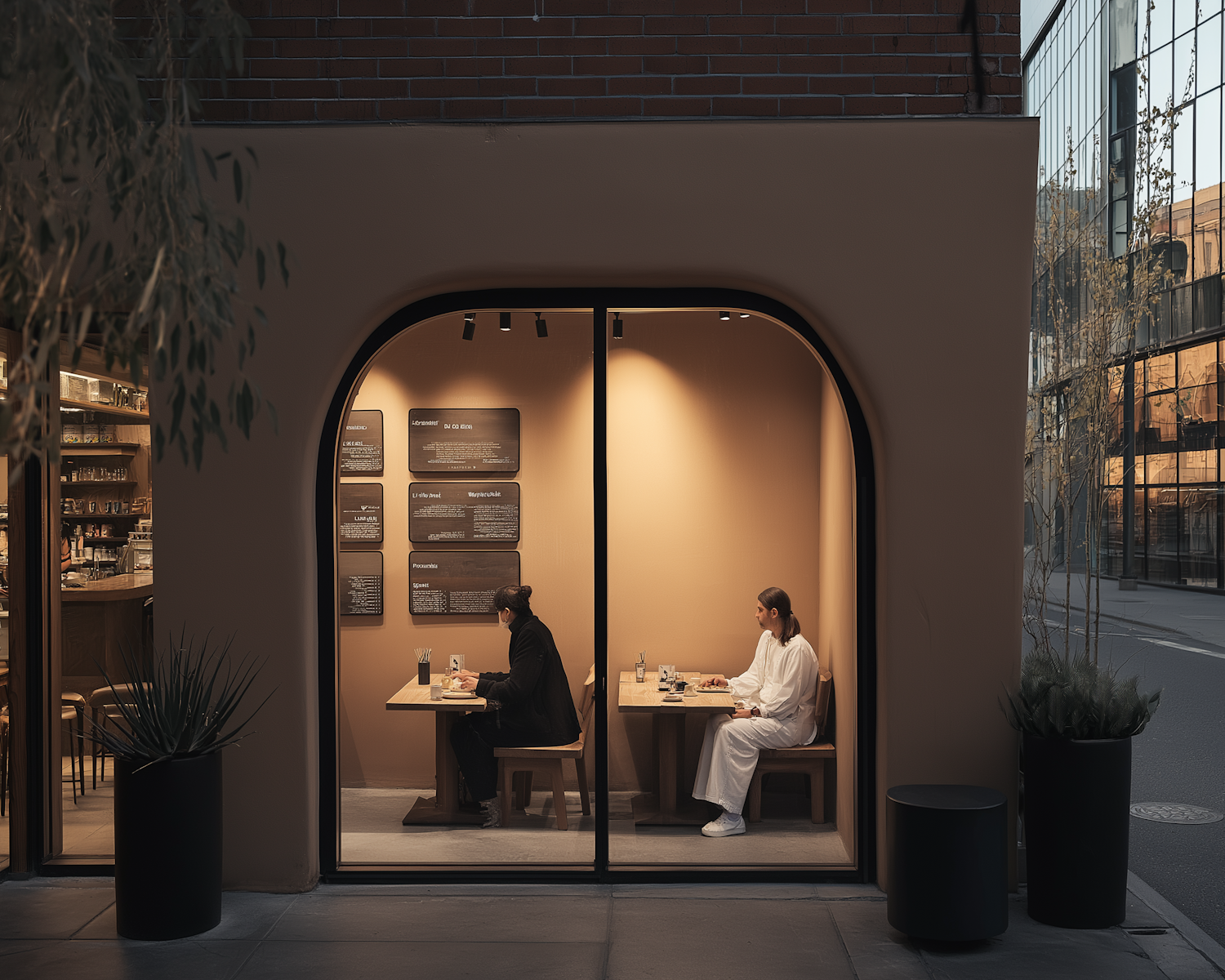 Two women dine separately in a cozy cafe with warm lighting and arched windows, creating a serene urban dining experience.