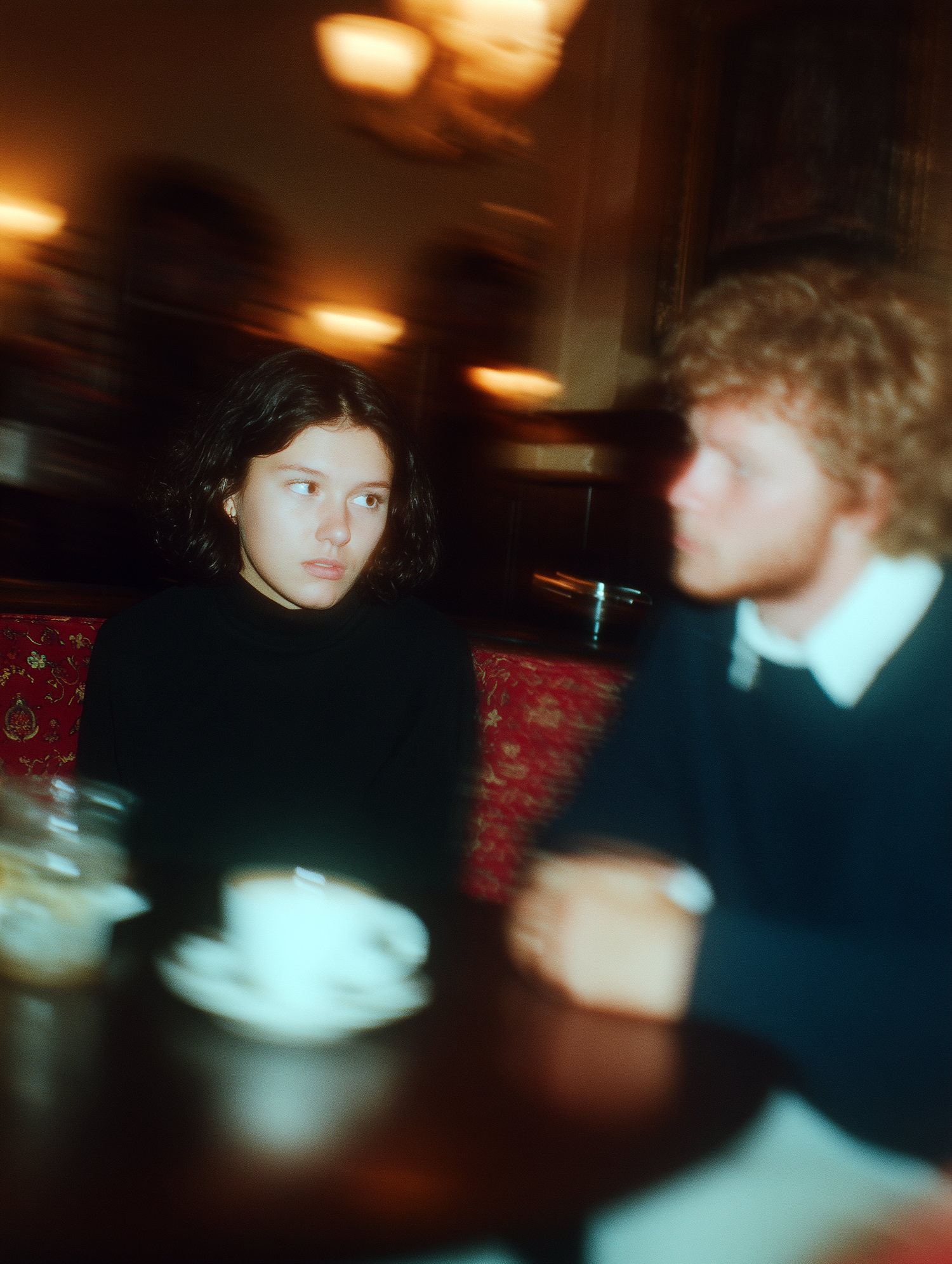 A cozy café setting with two individuals in conversation, warm lighting, and a relaxed atmosphere.