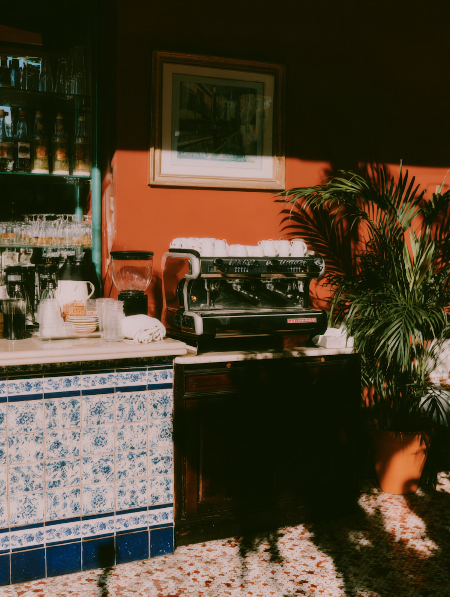 A charming café corner with a coffee machine, tiled counter, and vibrant orange walls, bathed in sunlight and shadow.