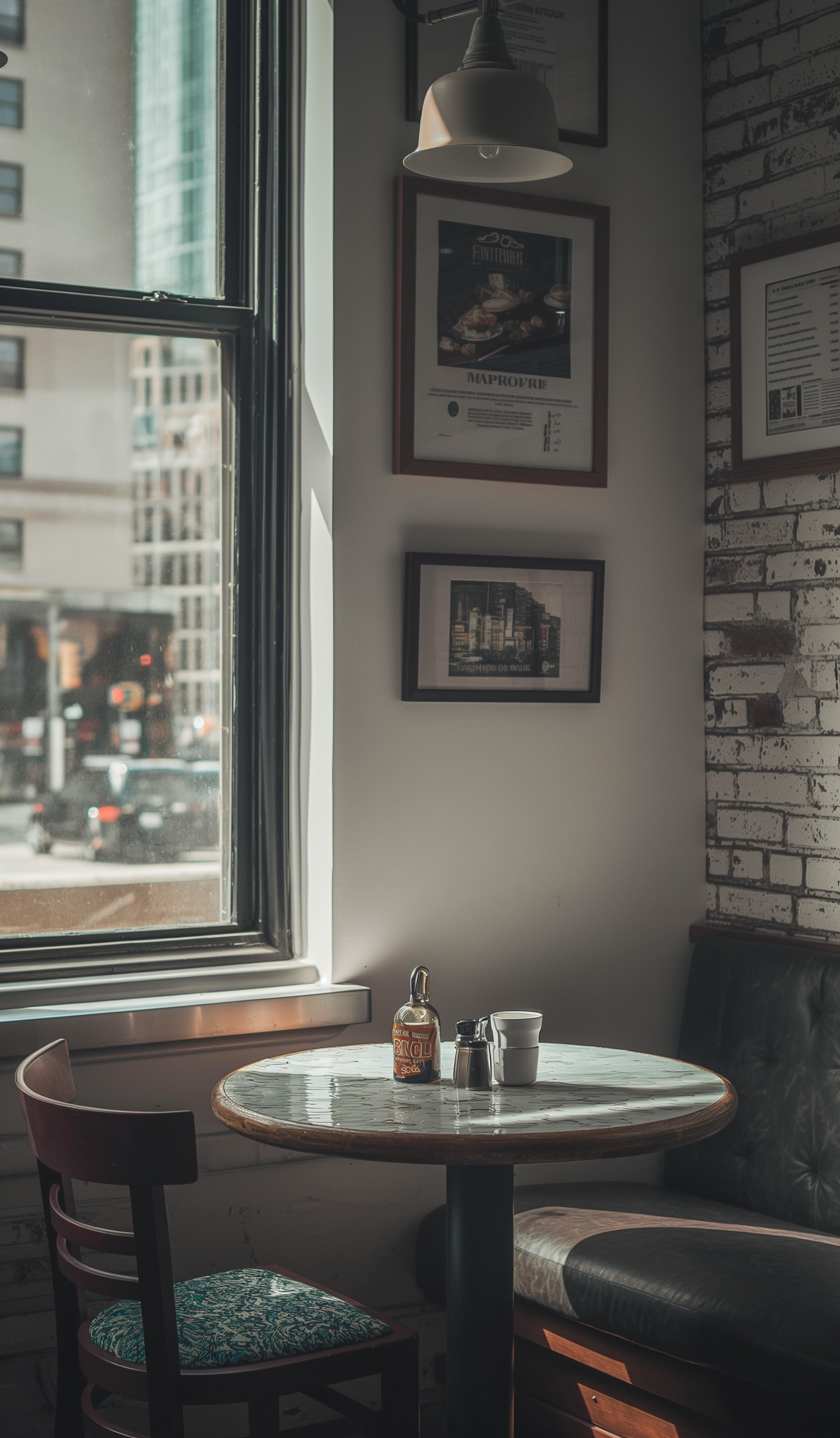 Cozy cafe corner with a round table, syrup bottle, and framed art. Sunlight streams through a window, creating a warm ambiance.
