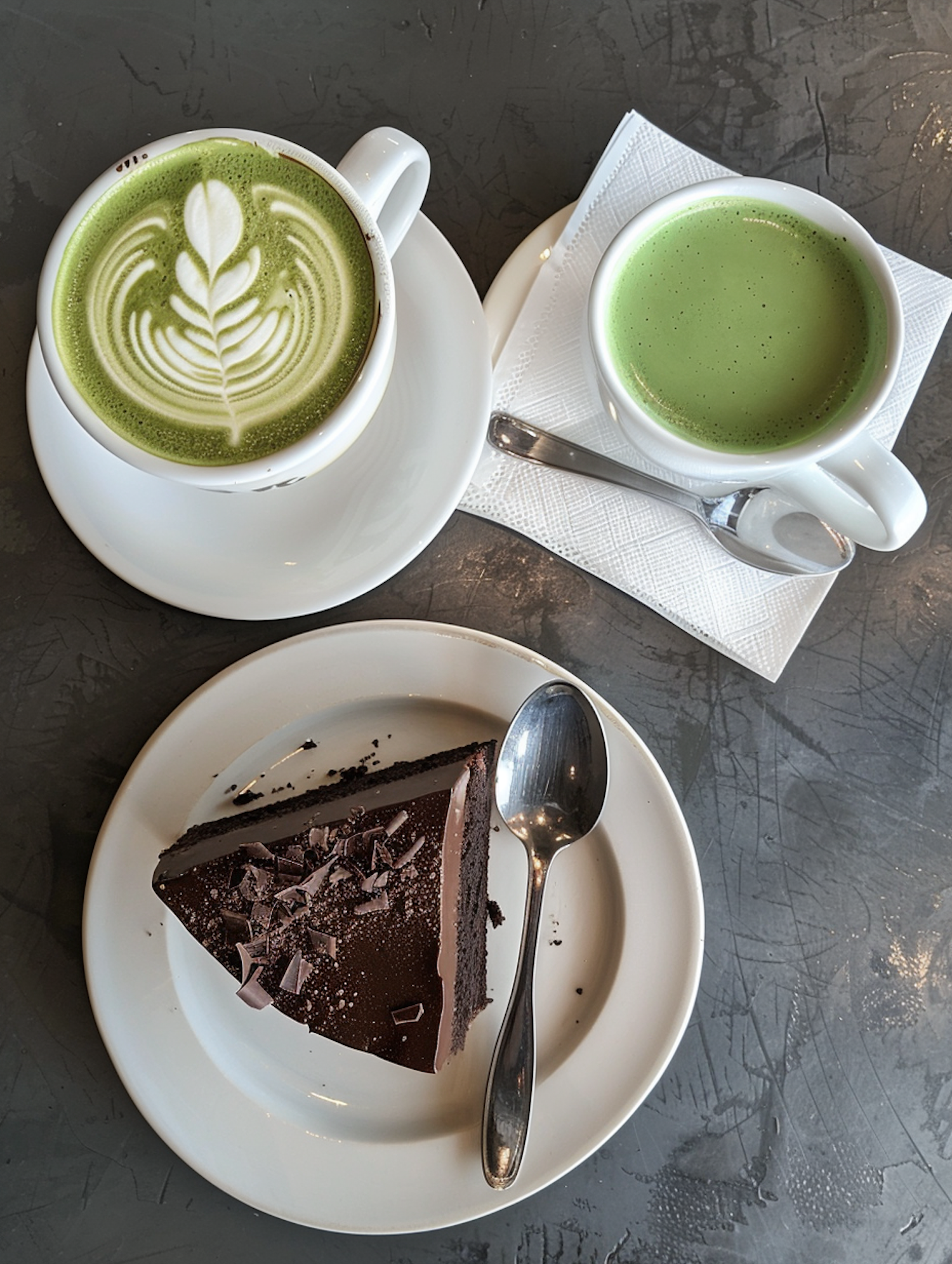 Matcha latte with latte art, plain matcha, and a slice of chocolate cake on a textured gray table.