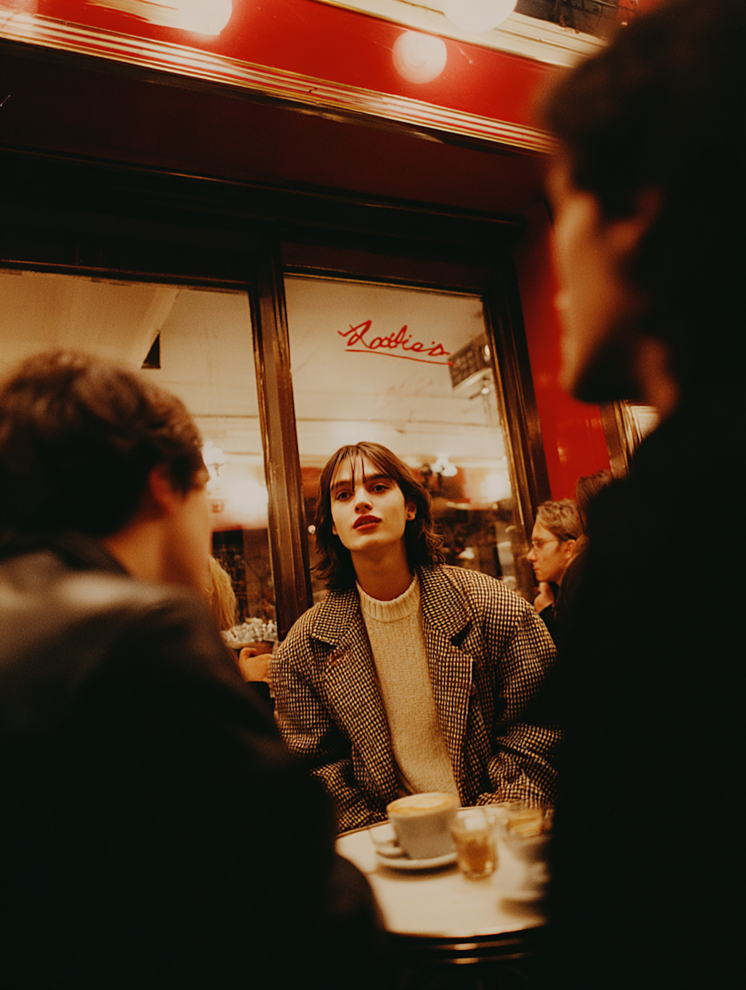 A warm café scene with friends gathered around a table, enjoying coffee and conversation in a cozy, inviting atmosphere.