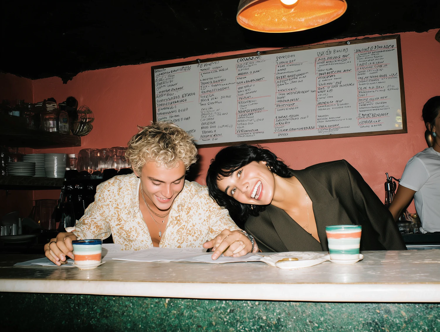 Two friends share a laugh at a cozy café counter, surrounded by warm lighting and a welcoming ambiance.