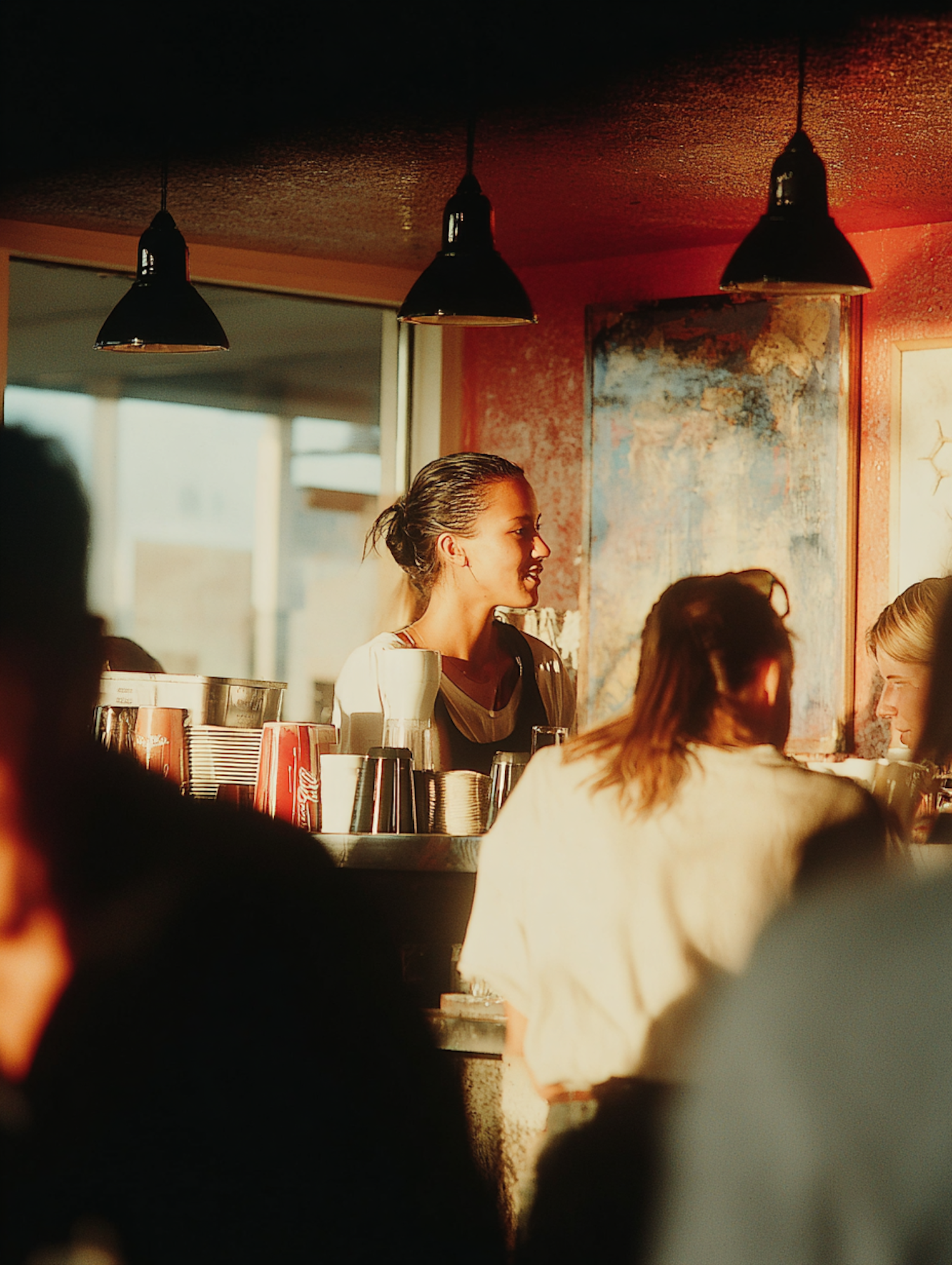 A barista interacts with customers in a warmly lit café, with golden sunlight and cozy pendant lighting enhancing the ambiance.