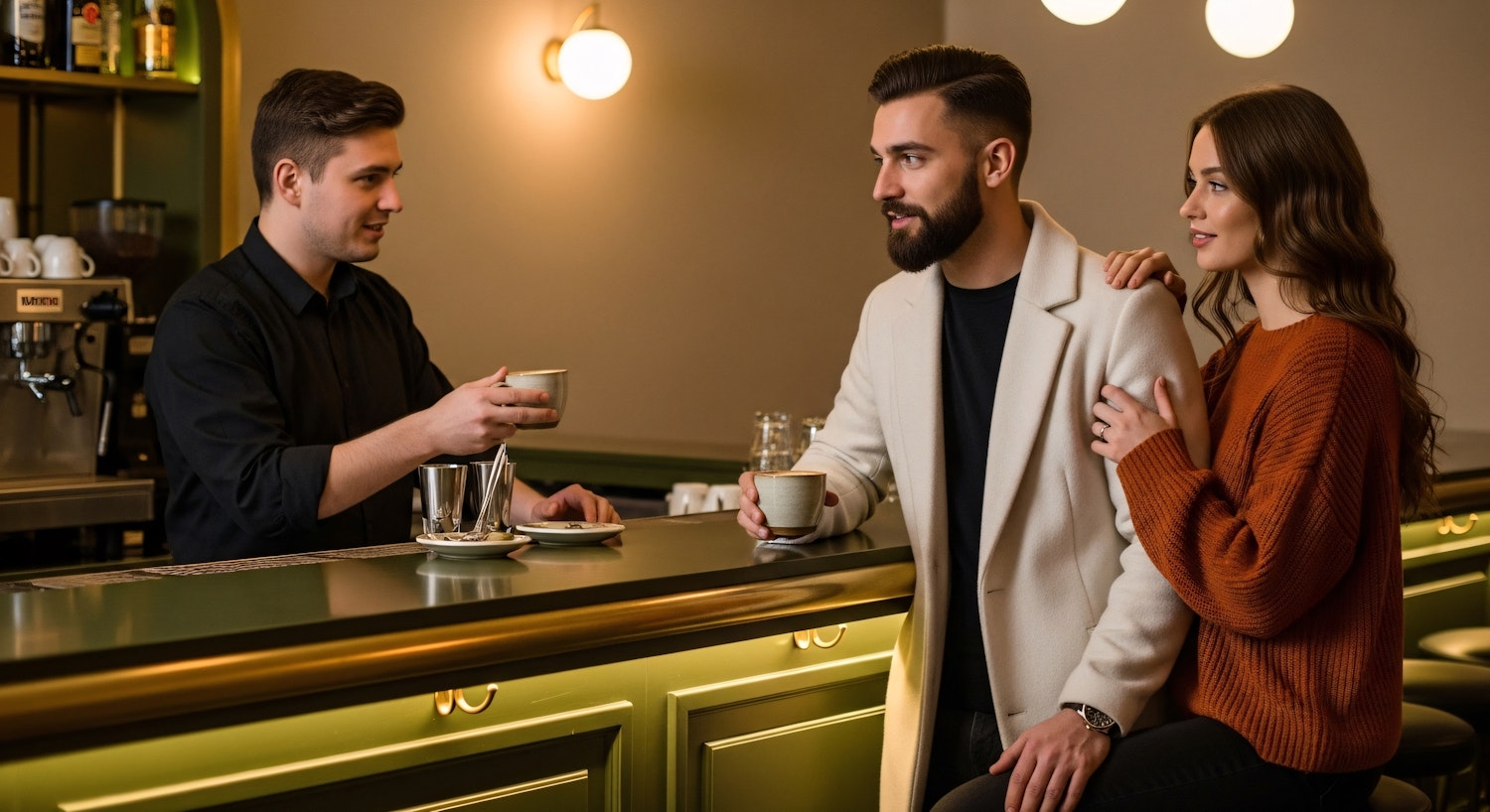 A barista serves coffee to a couple in a cozy café with warm lighting and stylish decor, creating a welcoming atmosphere.