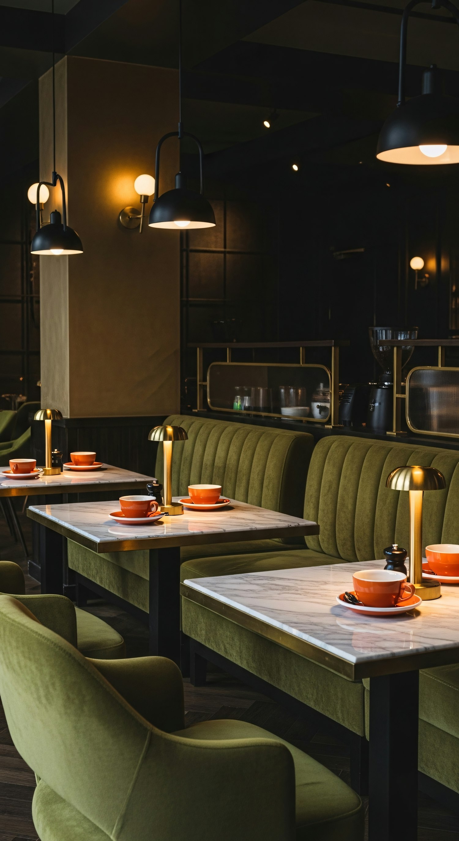 Cozy café interior with green seating, marble tables, orange coffee cups, and warm lighting for a modern and inviting ambiance.