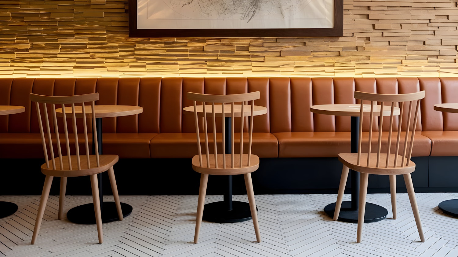 Modern café interior with caramel leather banquettes, wooden chairs, textured walls, and herringbone tile flooring. Warm and inviting vibe.