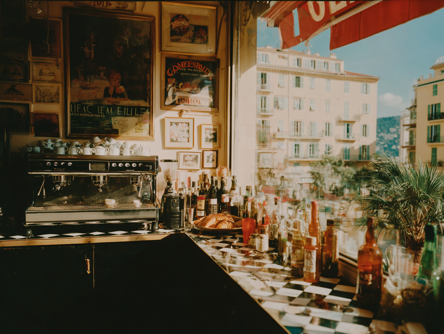A charming café with a vintage espresso machine, checkered counter, and a sunny view of European-style buildings and palm trees.