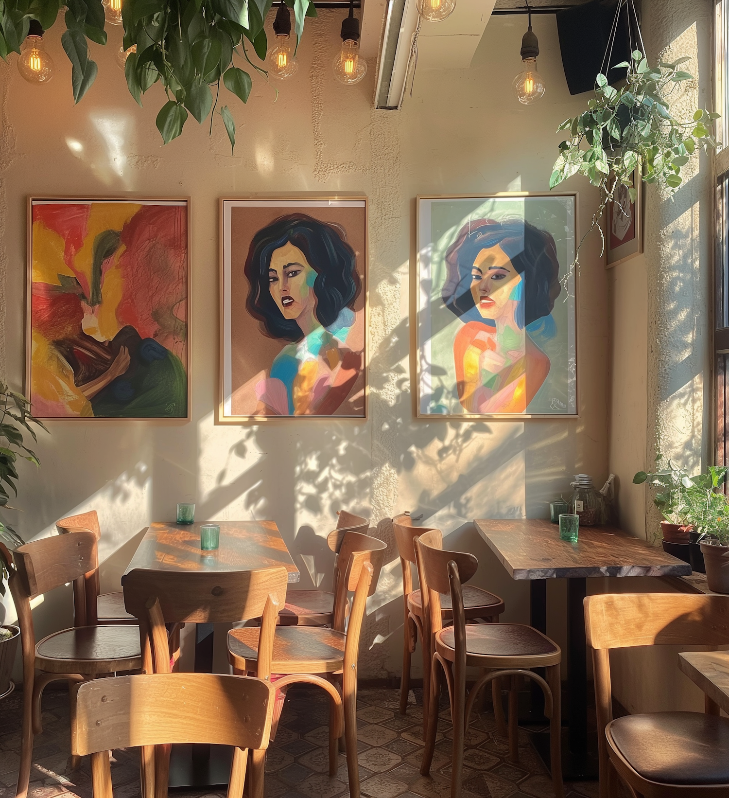 Cozy cafe with vibrant abstract portraits, wooden furniture, and hanging plants, bathed in warm sunlight for a serene ambiance.