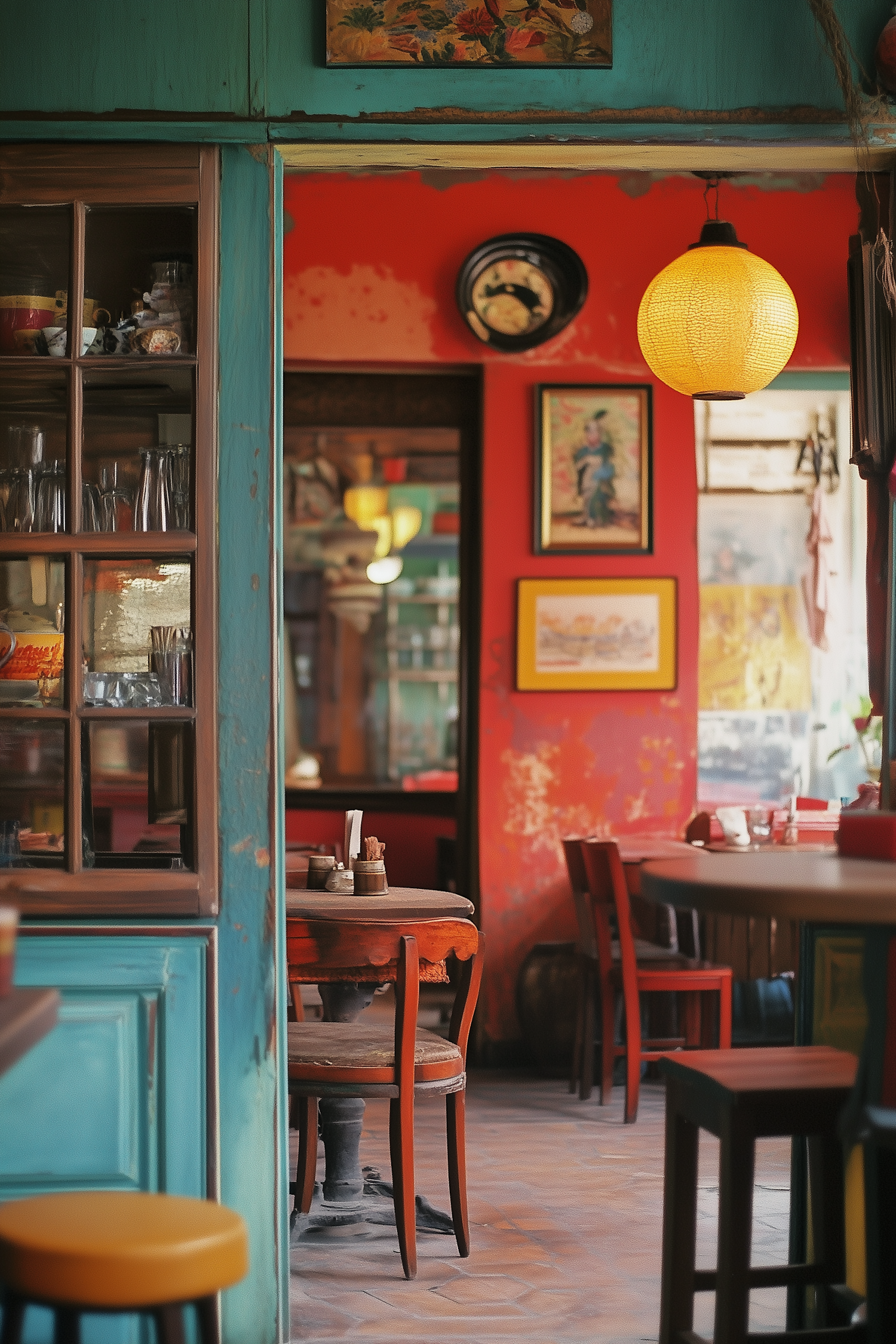 Eclectic café interior with vibrant red walls, vintage decor, and a cozy ambiance. Features a glowing lantern and turquoise accents.