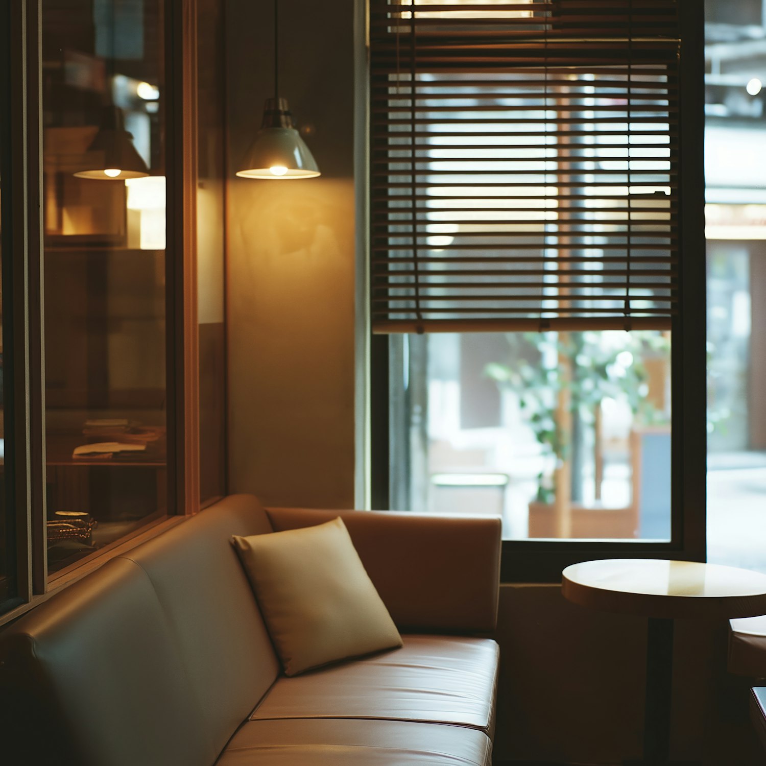 Cozy interior with a brown leather sofa, warm lighting, and wooden blinds. Perfect for a relaxing atmosphere.