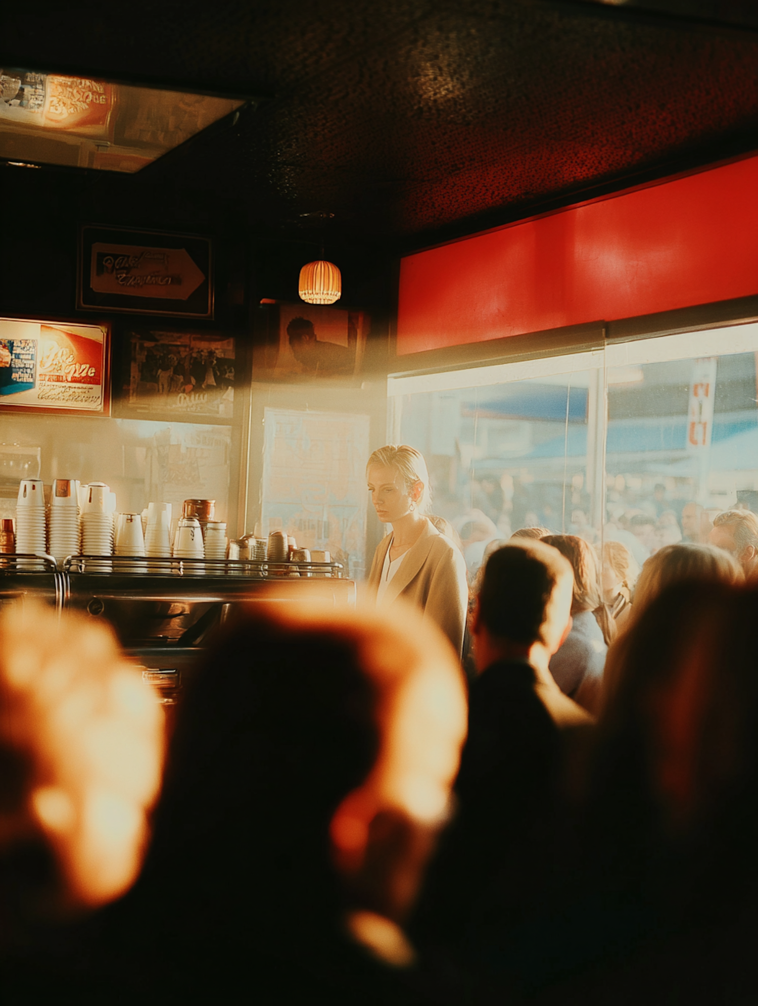 A cozy café scene with warm lighting, a bustling crowd, and a woman near the counter illuminated by sunlight.