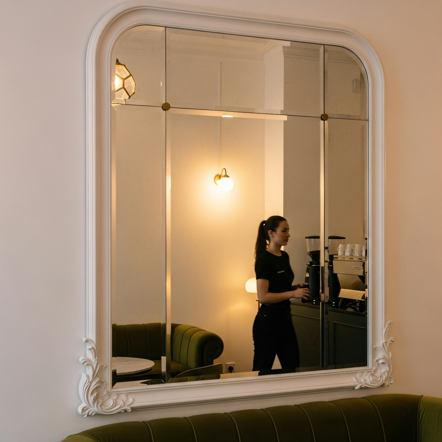 A stylish café interior reflected in an ornate mirror, featuring warm lighting, a green sofa, and a barista near a coffee machine.