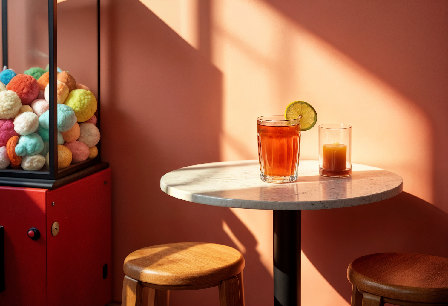 A cozy café table with iced tea and orange juice, wooden stools, and a colorful vending machine against a peach wall in warm sunlight.