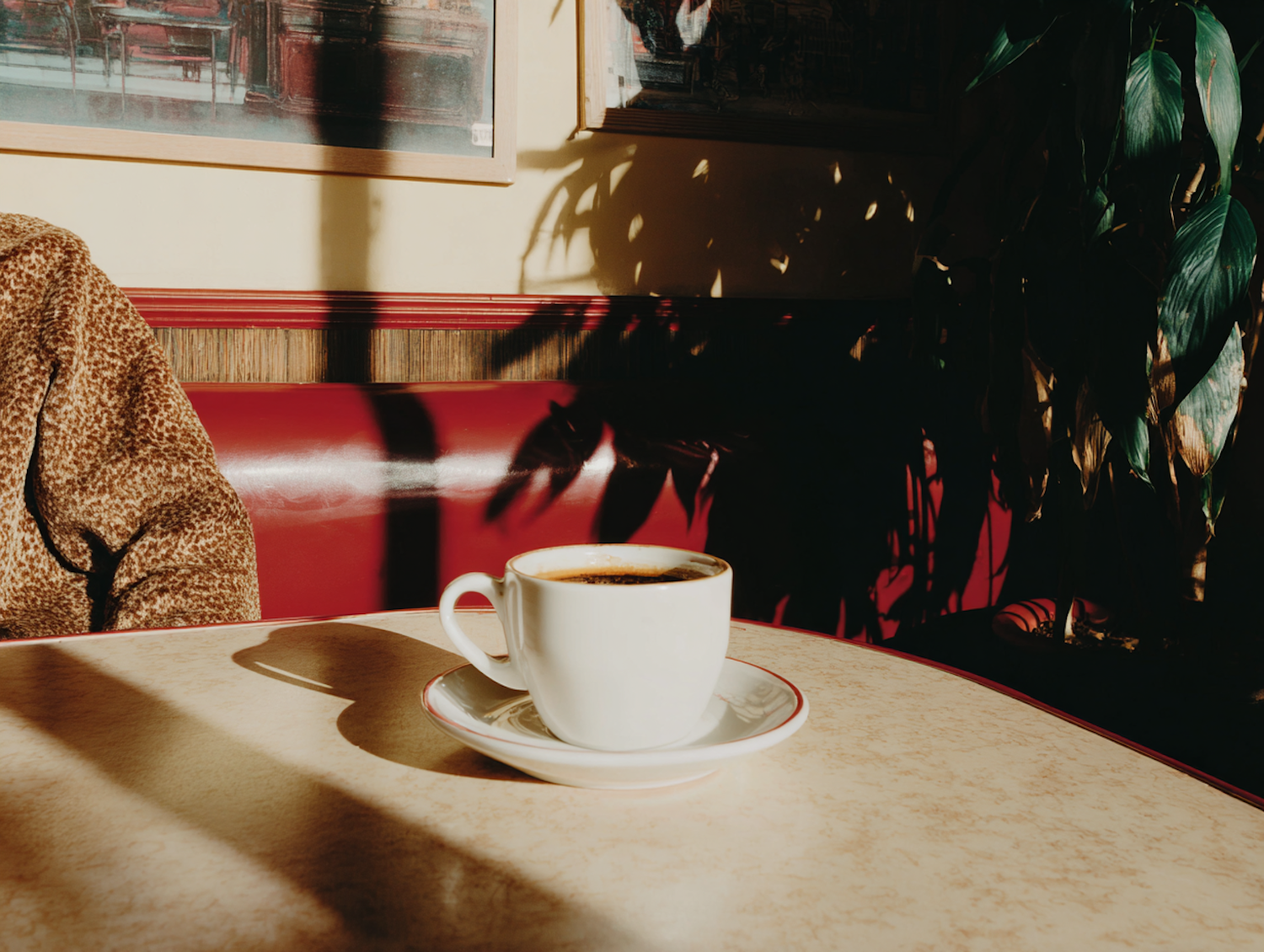 A warm café scene with a coffee cup on a sunlit table, red booth seating, and a leafy plant creating a cozy, inviting atmosphere.