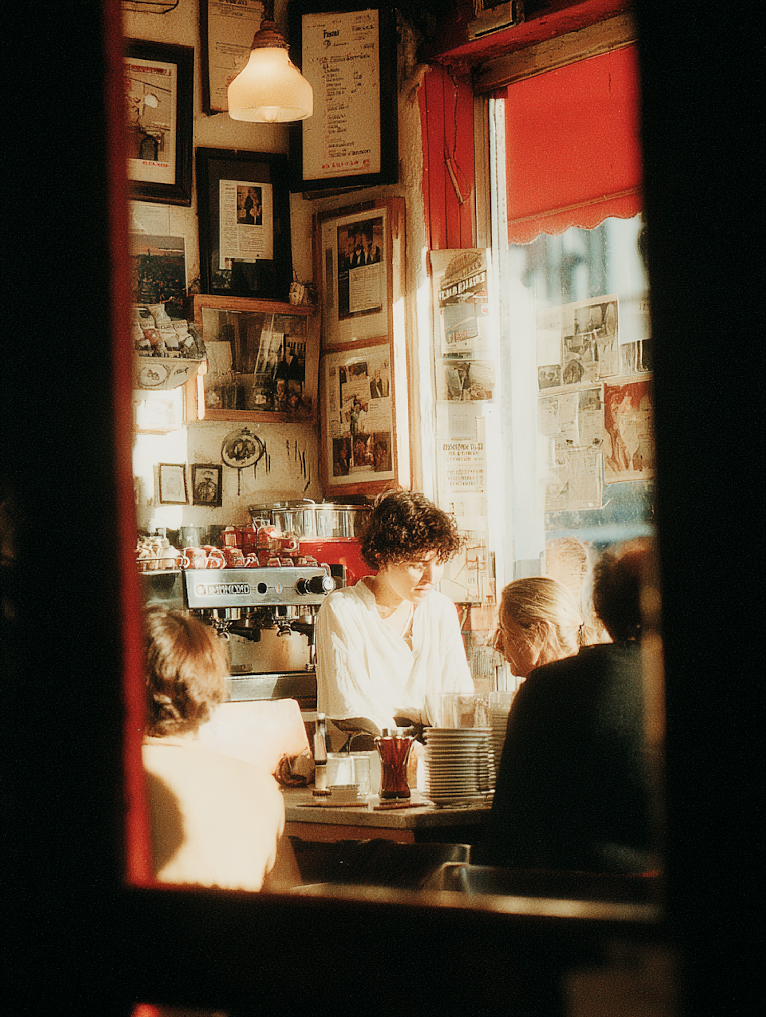 A warm café scene with a barista preparing drinks, cozy decor, and patrons enjoying the inviting atmosphere bathed in golden light.