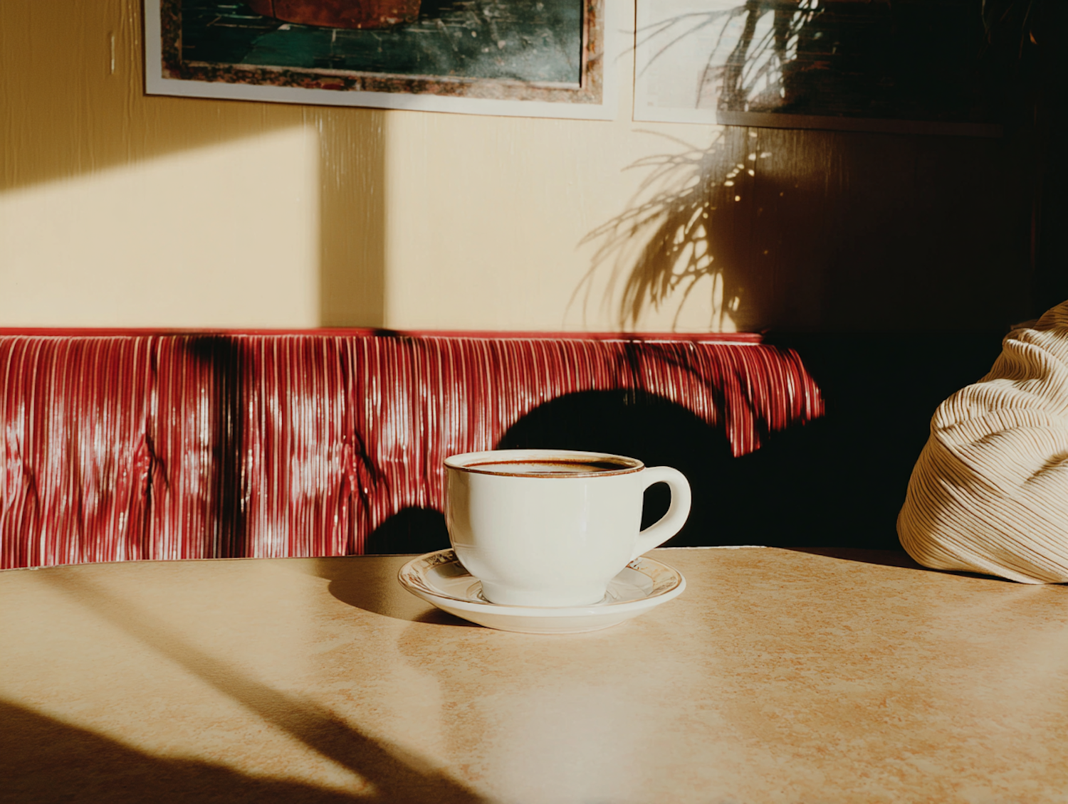 A warm café scene with a coffee cup on a table, sunlight casting shadows on a red booth and wall, creating a cozy atmosphere.