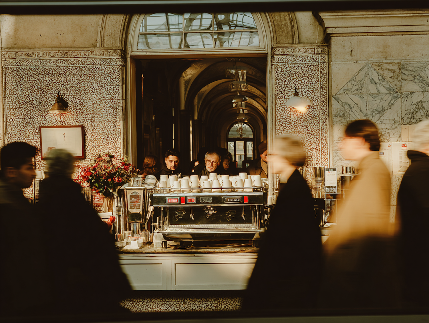 A cozy café with a barista counter, warm lighting, and blurred pedestrians in the foreground, creating a lively and inviting atmosphere.
