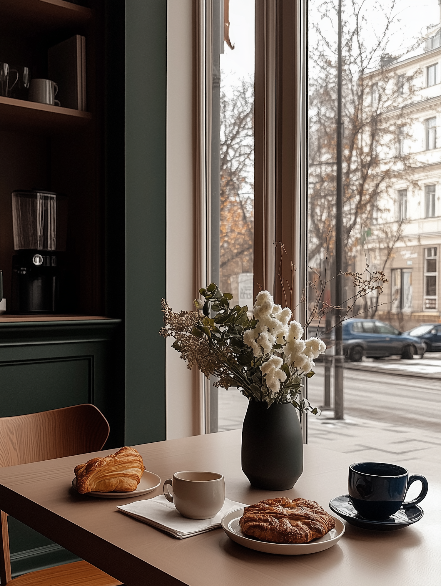 Cozy café table with coffee, croissants, and flowers by a window overlooking a quiet street. Perfect for a relaxing morning vibe.