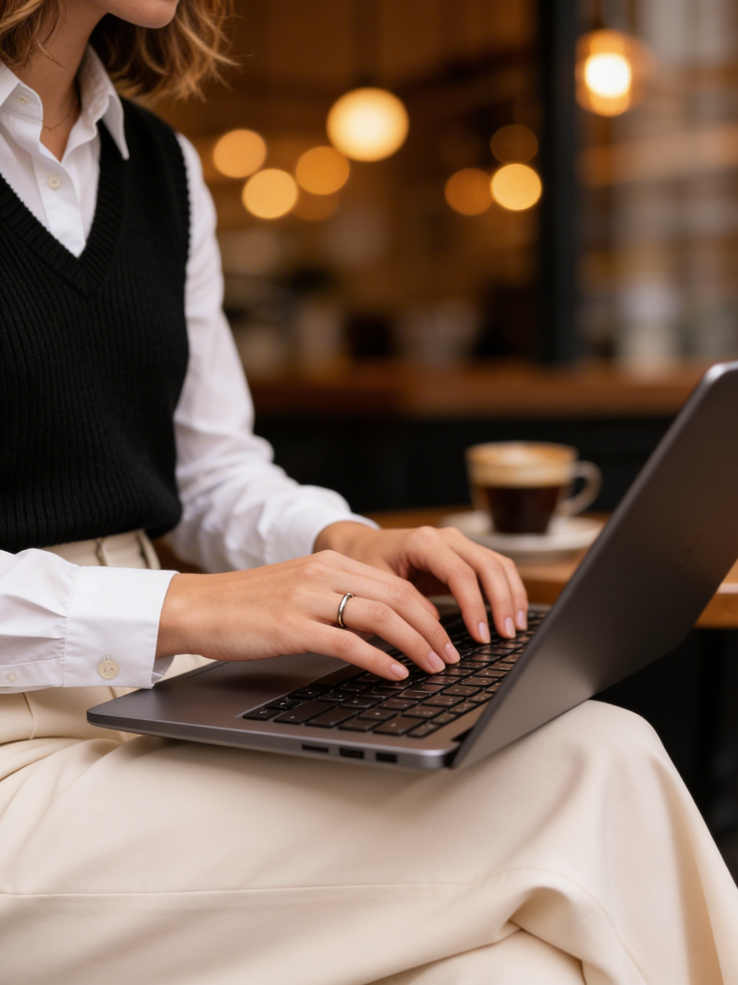 A person typing on a laptop in a cozy café, wearing a white shirt and black sweater, with a coffee cup in the background.