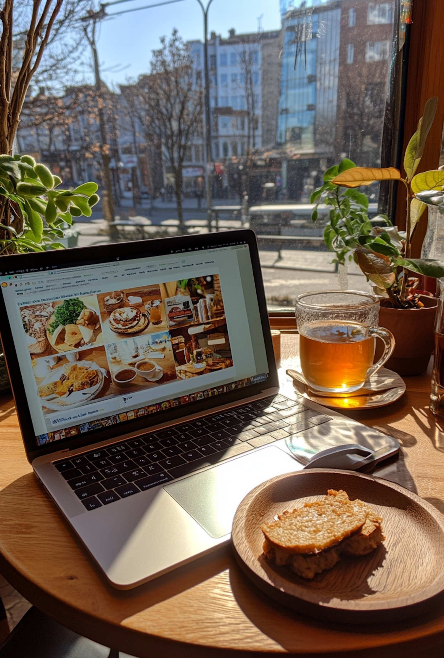 Cozy café table with a laptop, tea, and bread, bathed in sunlight with a view of a city street through the window.