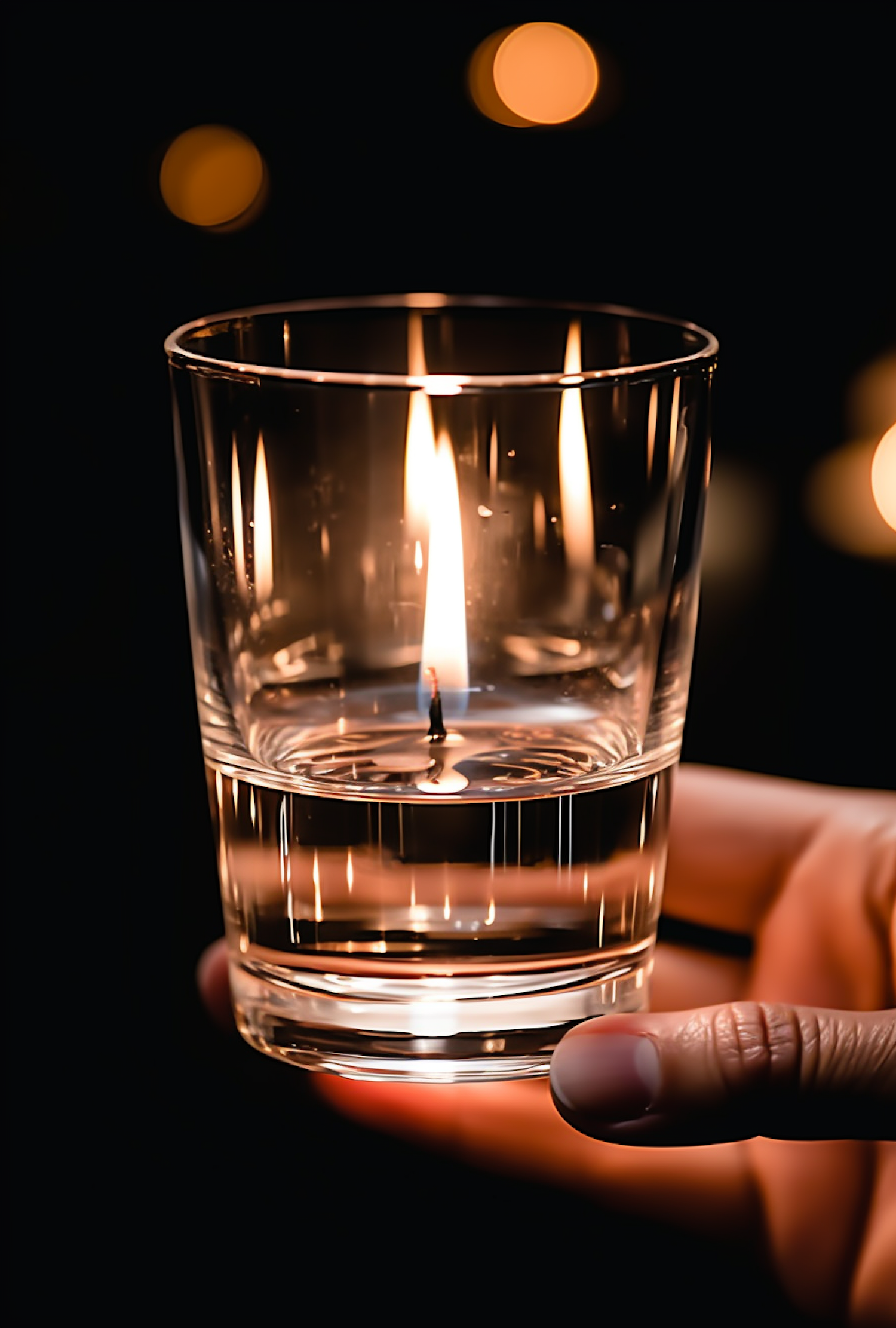 A candle flame floats inside a glass of water, casting a warm glow. Held by a hand, the scene is intimate and mesmerizing.