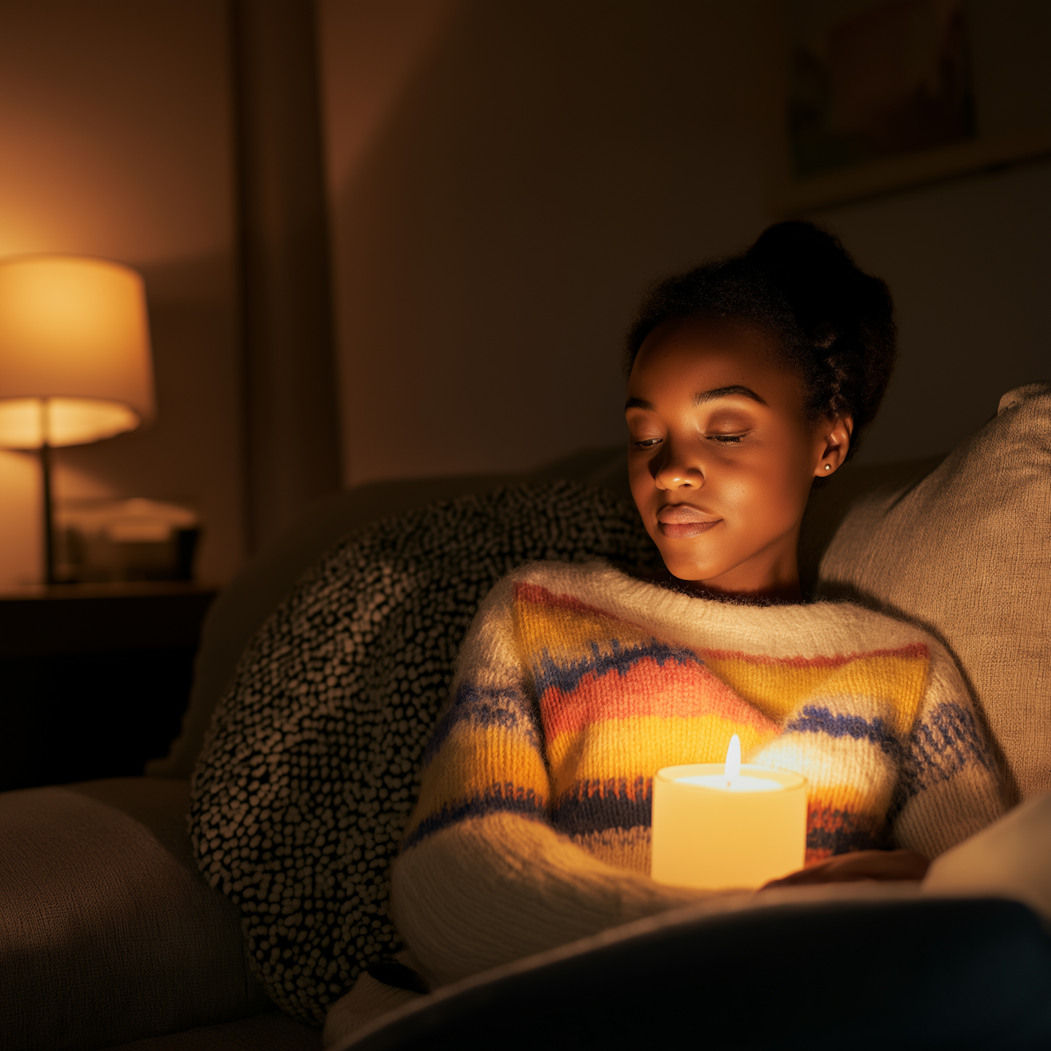 A serene moment of a young woman holding a glowing candle, wearing a colorful sweater, in a dimly lit, cozy room.