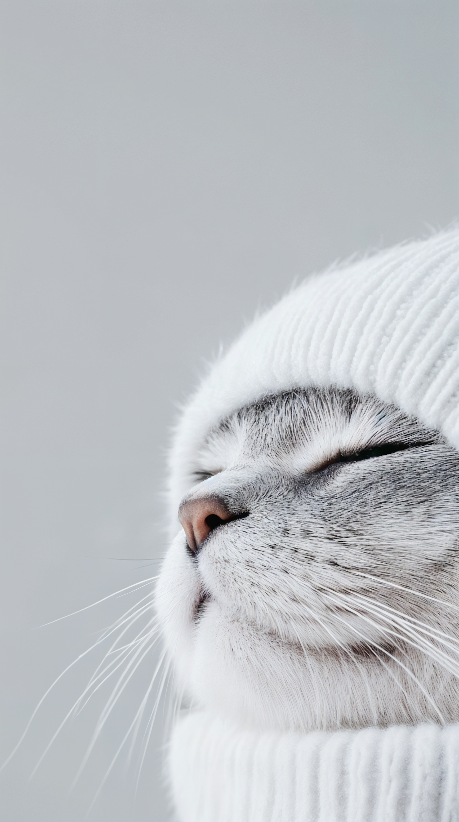 Close-up of a serene cat wearing a white knitted hat, eyes closed in contentment against a soft gray background.