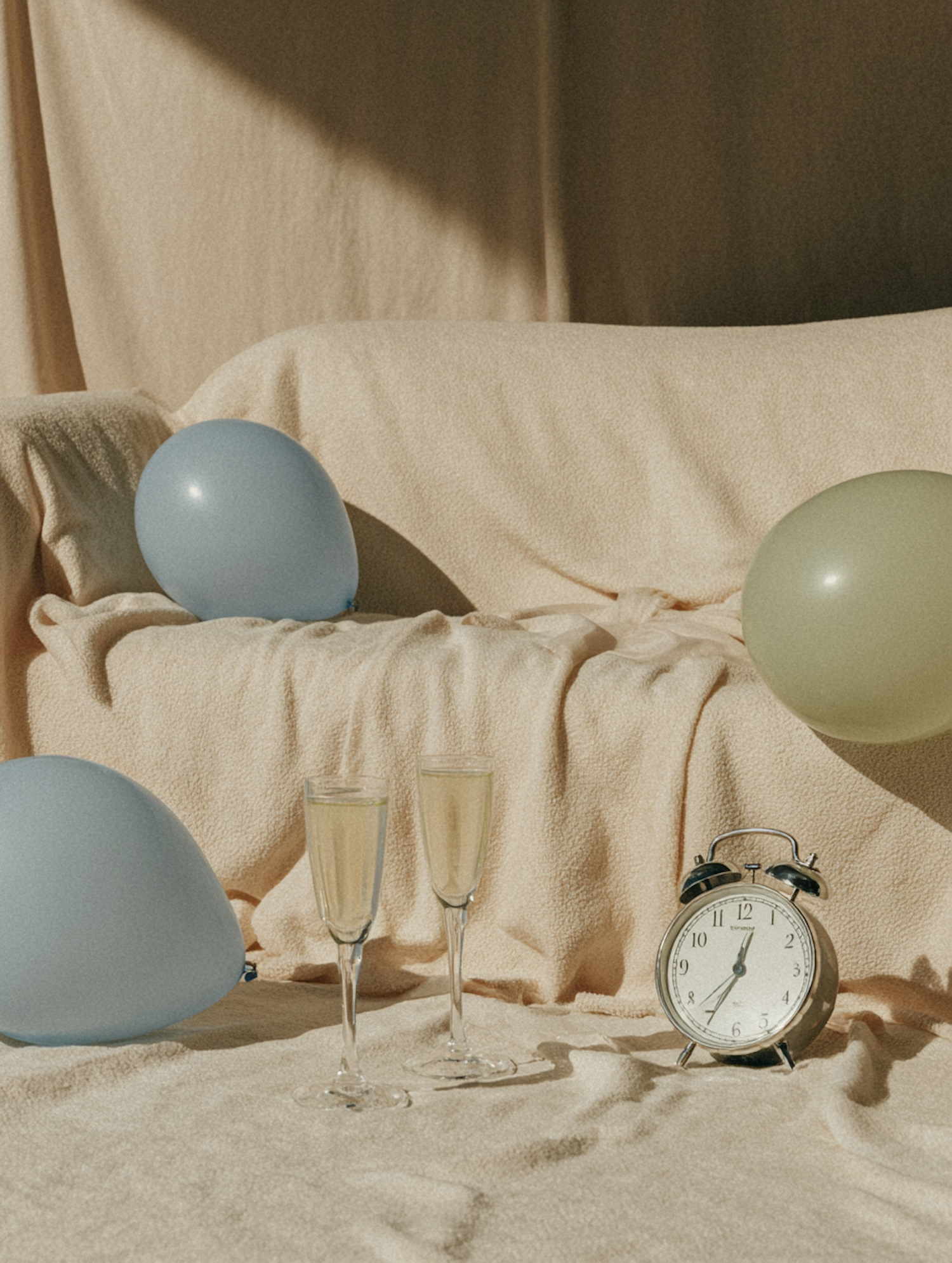 A cozy setup with balloons, champagne glasses, and a vintage clock on a beige fabric background, evoking a celebratory mood.