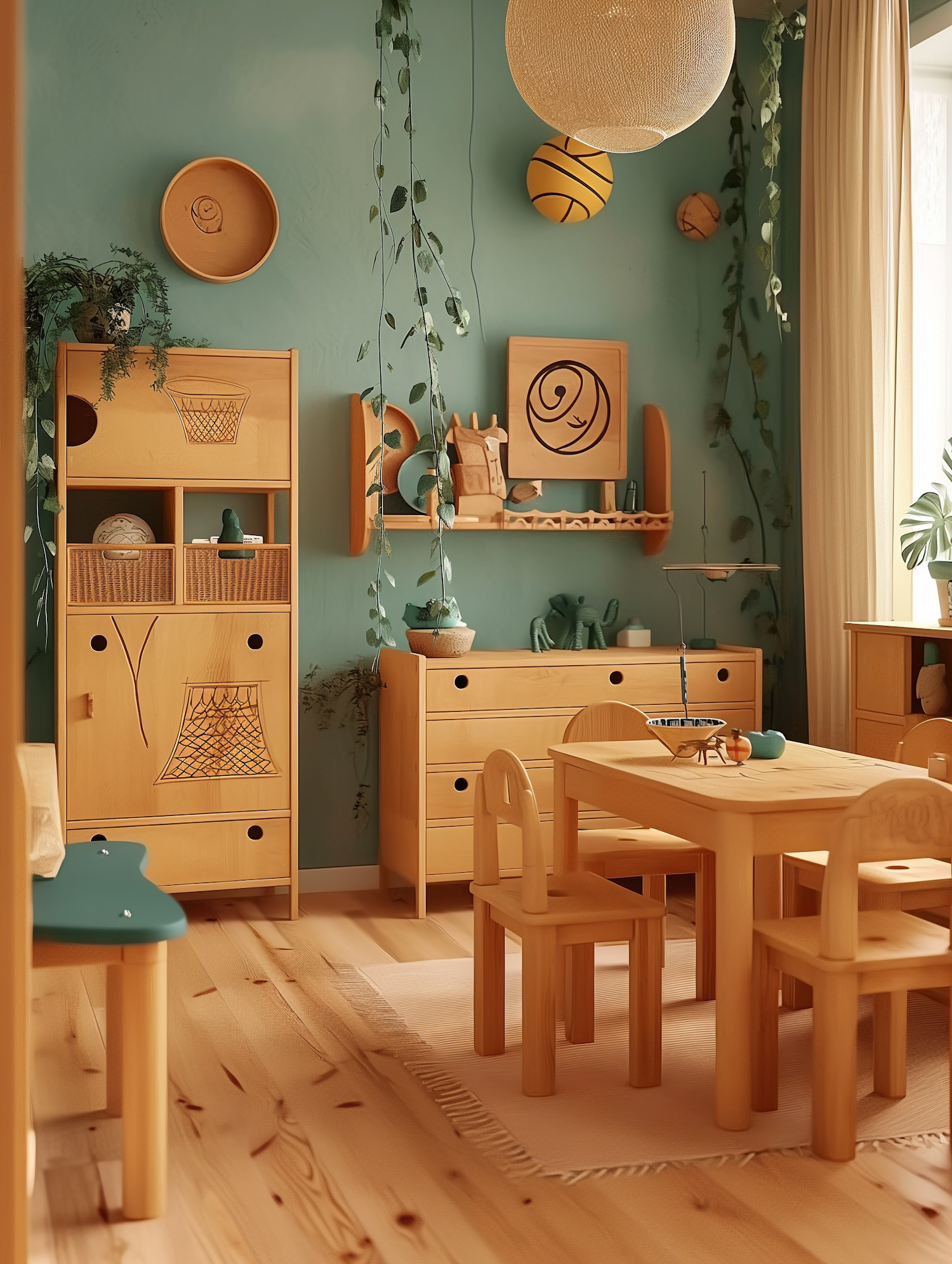 Charming children's room with wooden furniture, teal walls, and playful decor. Features hanging plants and a cozy atmosphere.