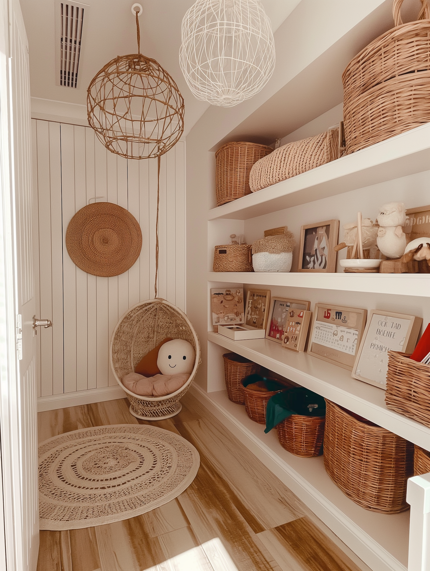 Cozy room with wicker decor, hanging chair, and organized shelves. Warm tones and natural textures create an inviting atmosphere.