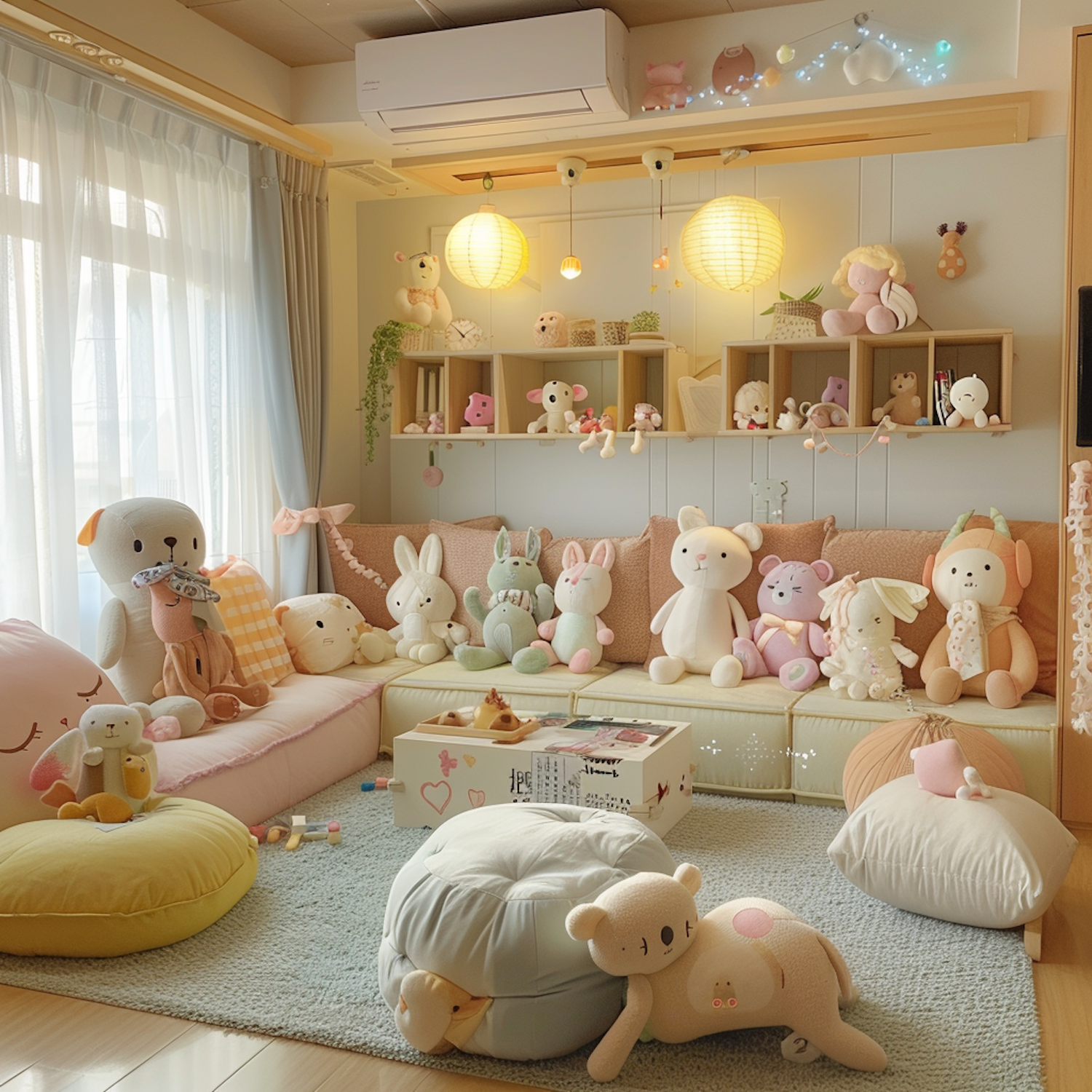 Charming living room with pastel plush toys, cozy sofa, and warm lighting, creating a playful and serene atmosphere.