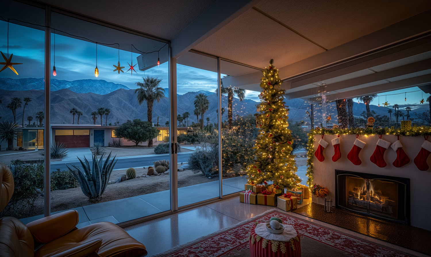 Cozy living room with Christmas tree, stockings, and fireplace, overlooking a desert landscape with mountains and palm trees.