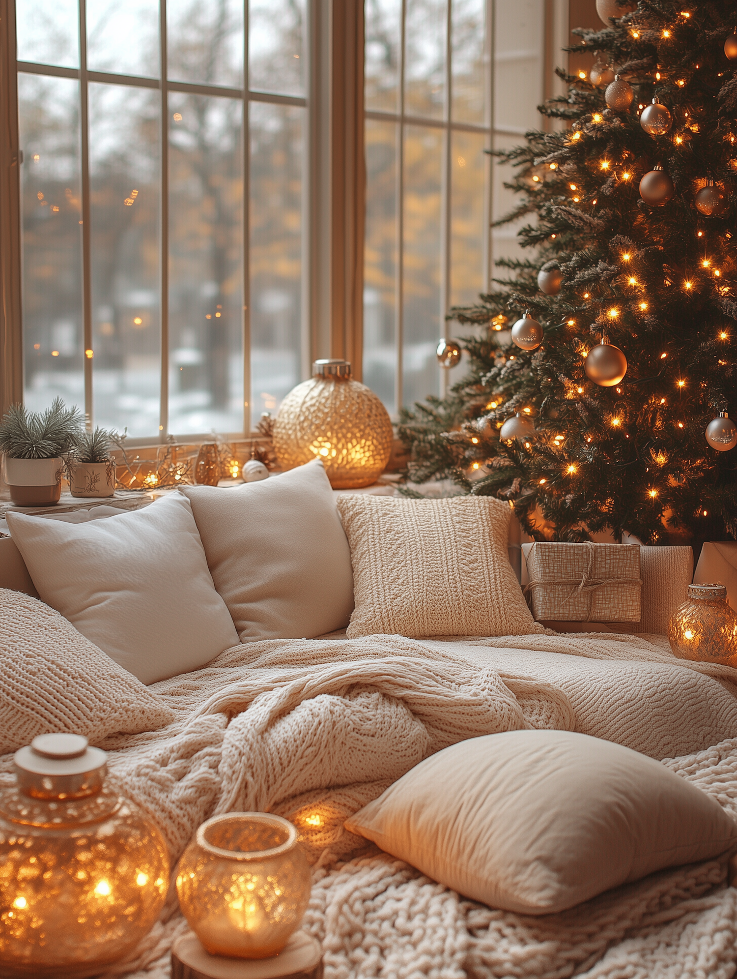 Cozy living room with Christmas tree, warm lights, plush pillows, and glowing candles, creating a festive and inviting winter atmosphere.
