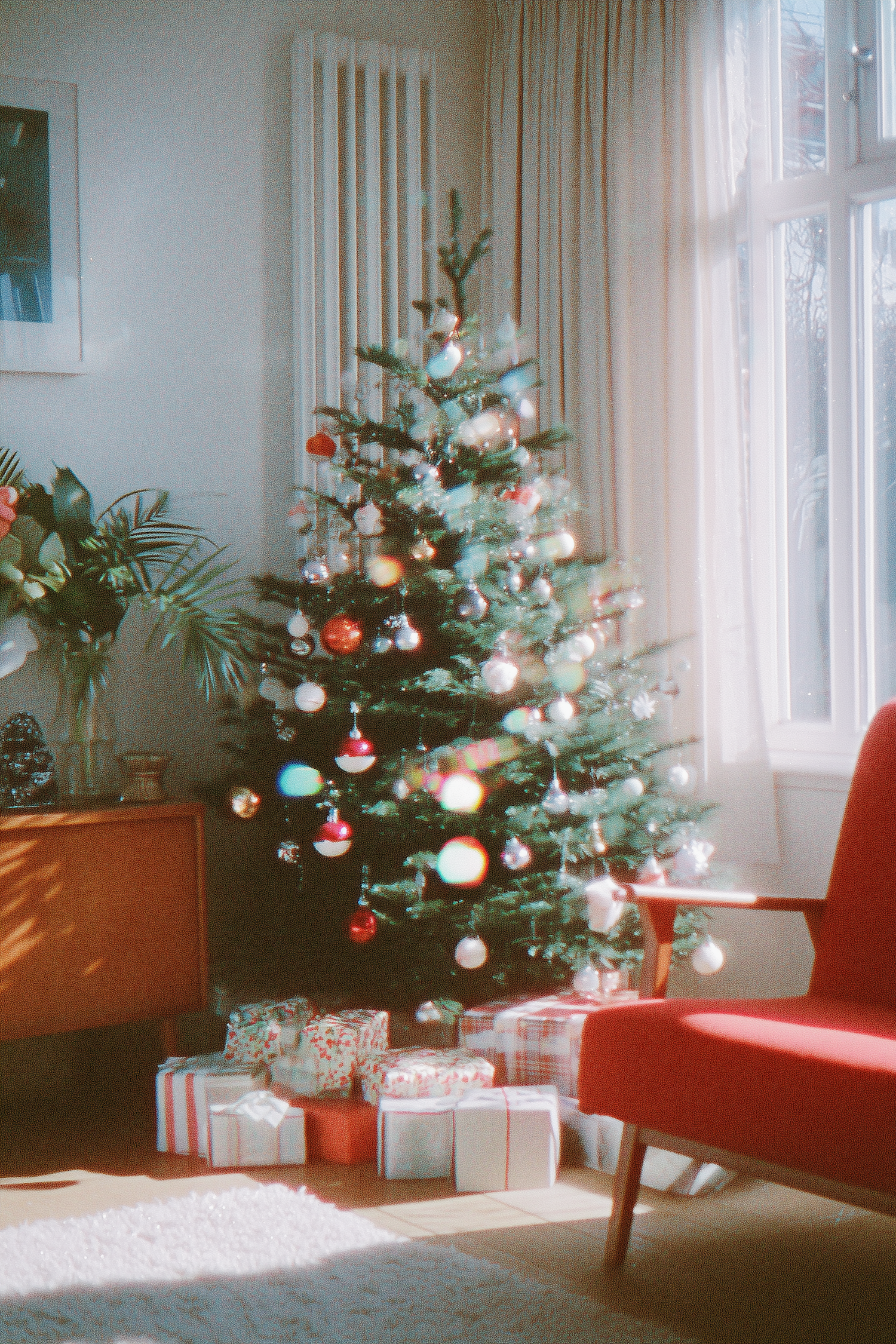 A festive living room with a decorated Christmas tree, wrapped presents, and a cozy red armchair by the window.