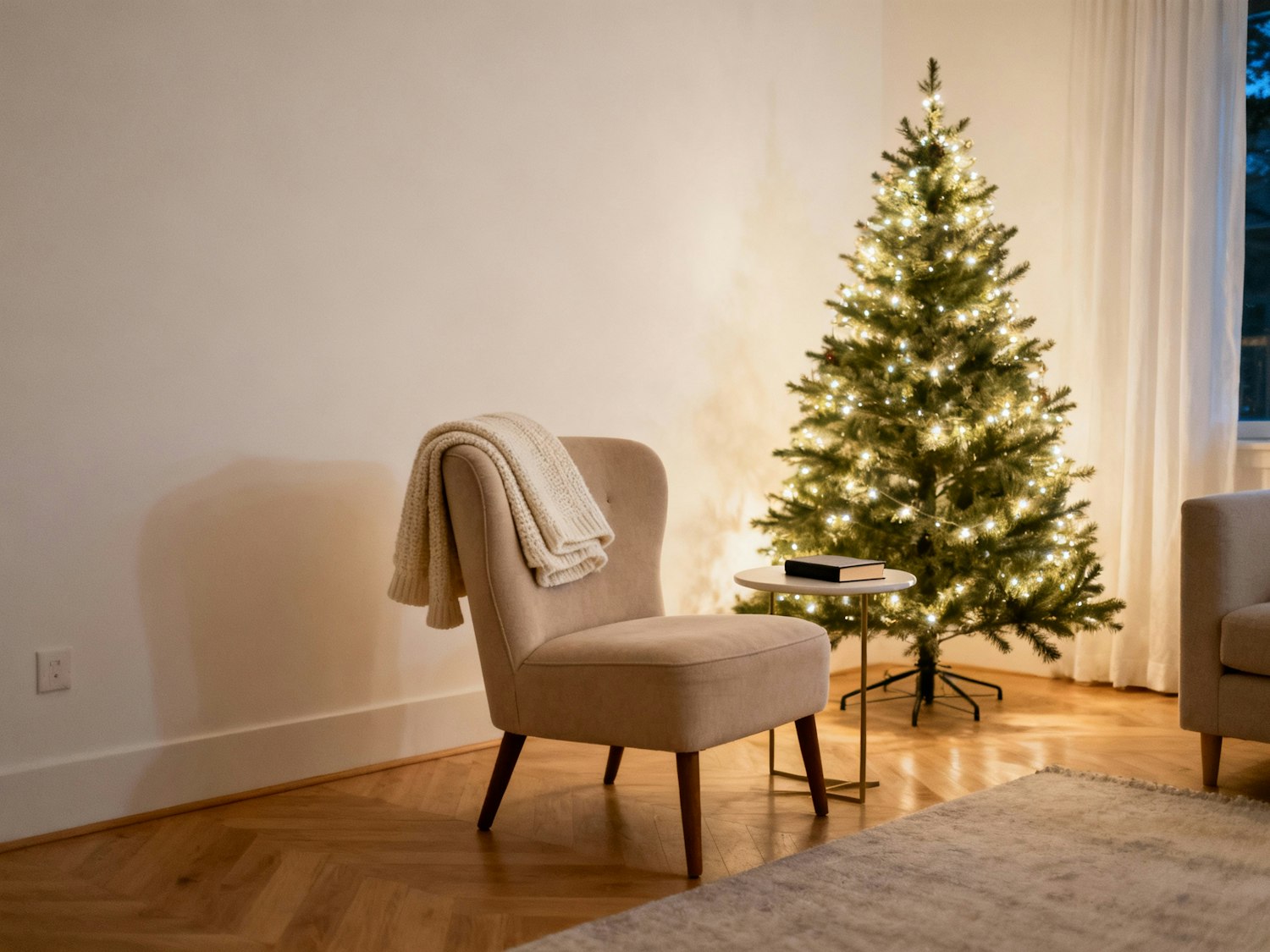 A cozy living room with a beige chair, a lit Christmas tree, and a small table with a book, creating a warm and inviting atmosphere.