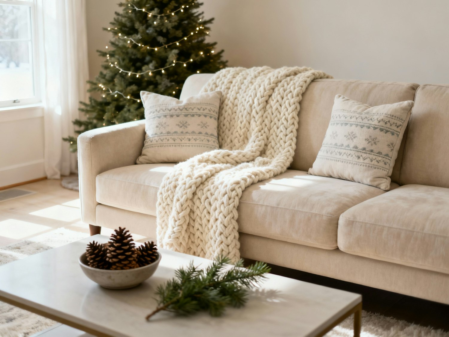 Bright living room in daytime with beige sofa, chunky knit throw in cream, two holiday-style cushions in neutral tones (not graphic), low coffee table with a small bowl of pine cones and a sprig of greenery; Christmas tree visible in background, string lights softly glowing; daylight from window on left. 35 mm, f/4, ISO 100, 1/160 s. Negative: typography décor (“Merry Christmas” signs), glitter overload, harsh flash.