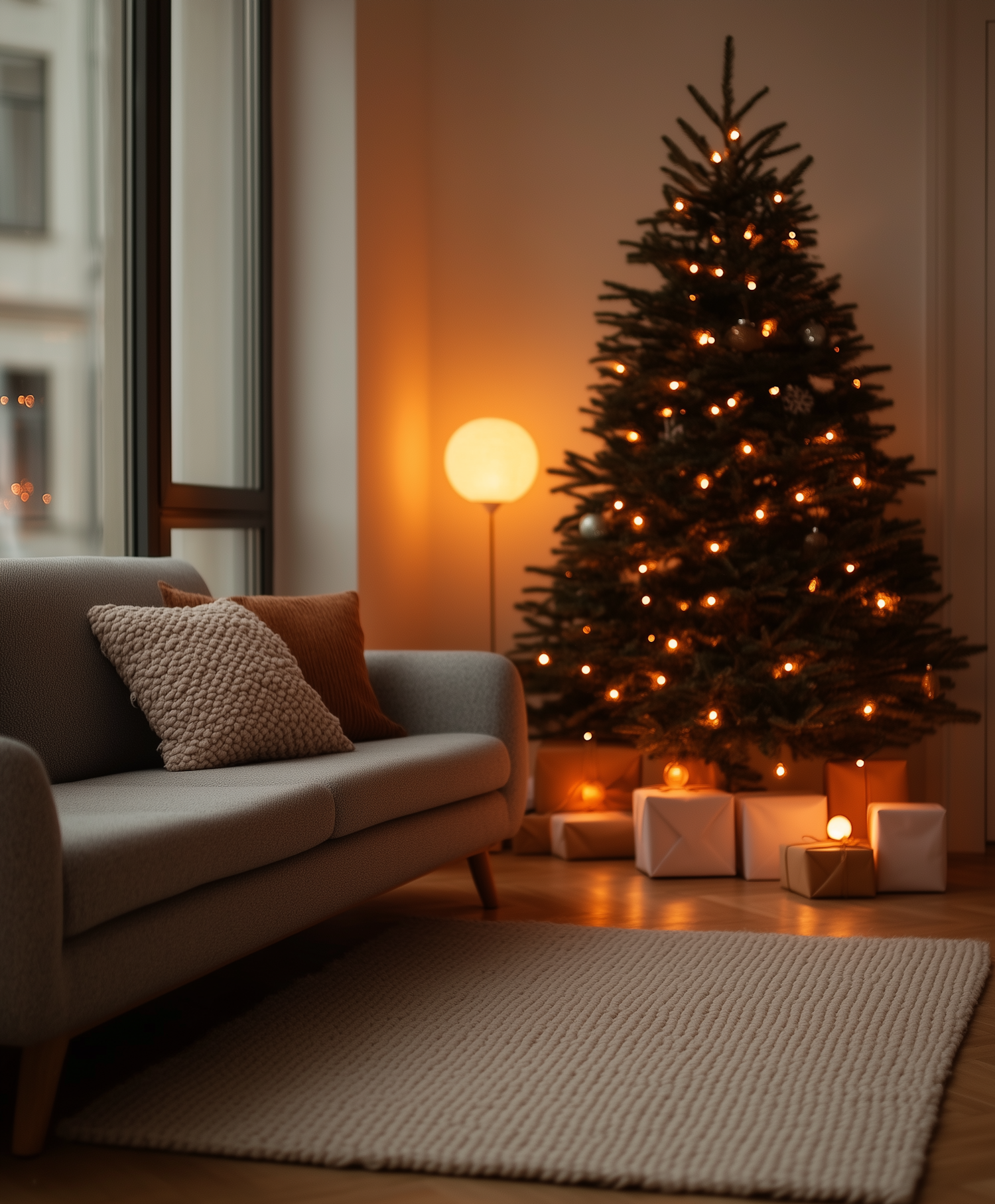 Cozy living room with a Christmas tree, glowing lights, wrapped gifts, and a modern sofa. Warm, inviting holiday ambiance.