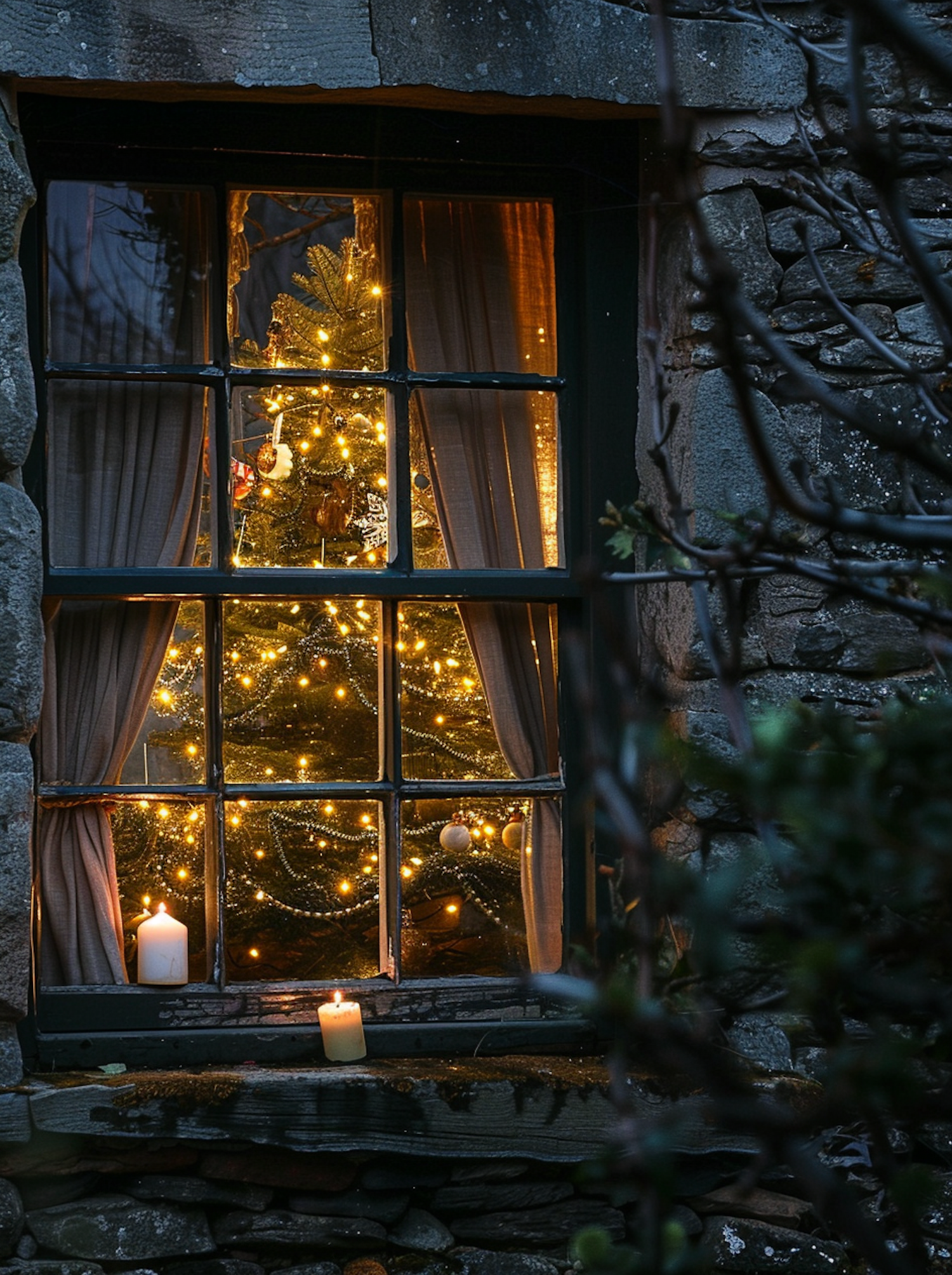 Cozy Christmas scene with a lit tree and candles seen through a rustic stone window, creating a warm holiday ambiance.