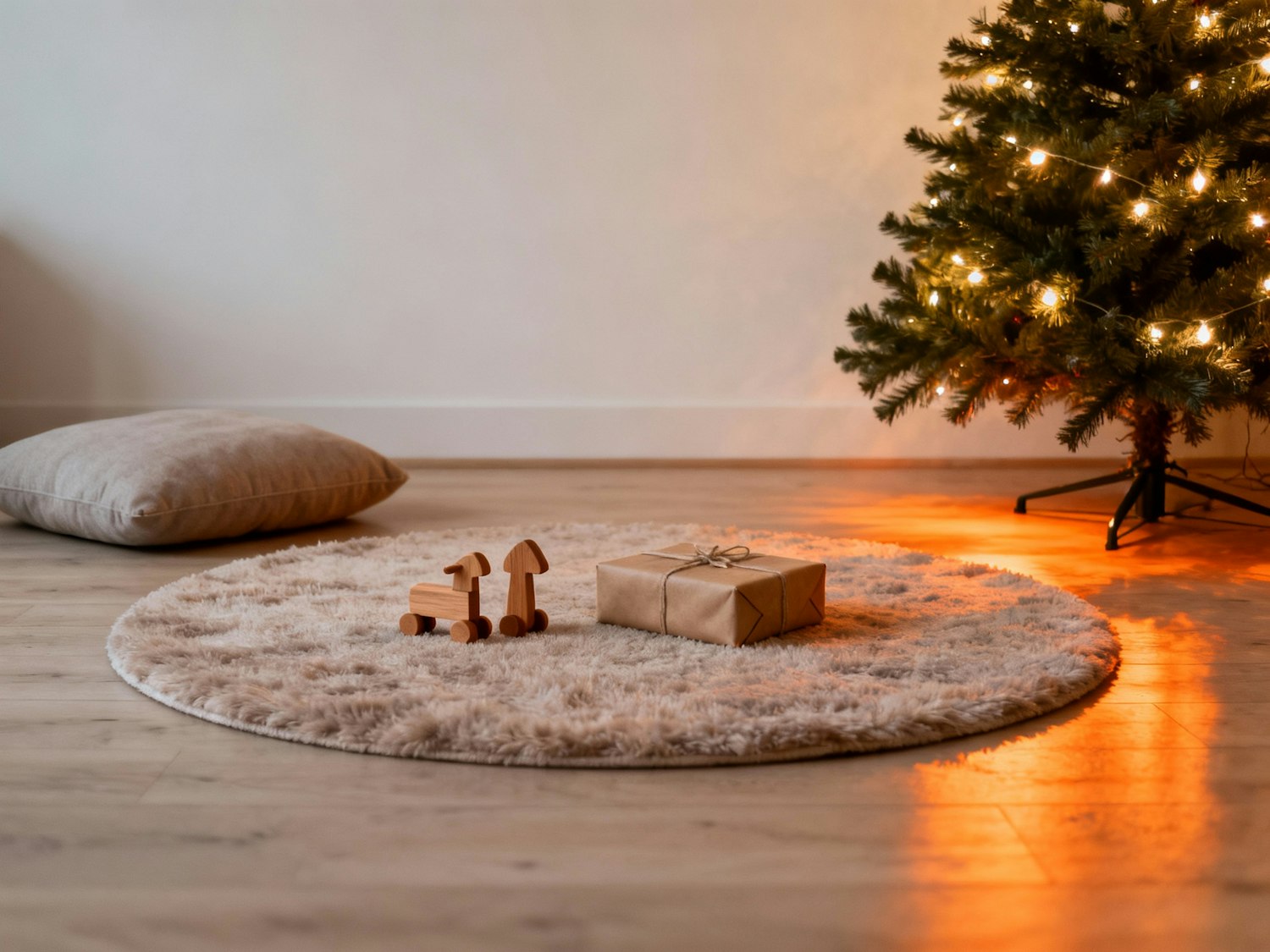 Evening living room corner with round soft rug on light wood floor, neutral floor cushion, two wooden/toy-style objects (non-branded) and a single wrapped gift; Christmas tree with warm lights is close, giving a gentle orange/gold spill on the floor; background wall off-white, no extra décor. 35 mm, f/2.8, ISO 800, 1/80 s; warm WB. Negative: bright plastic toys, text décor, strong colored lights.