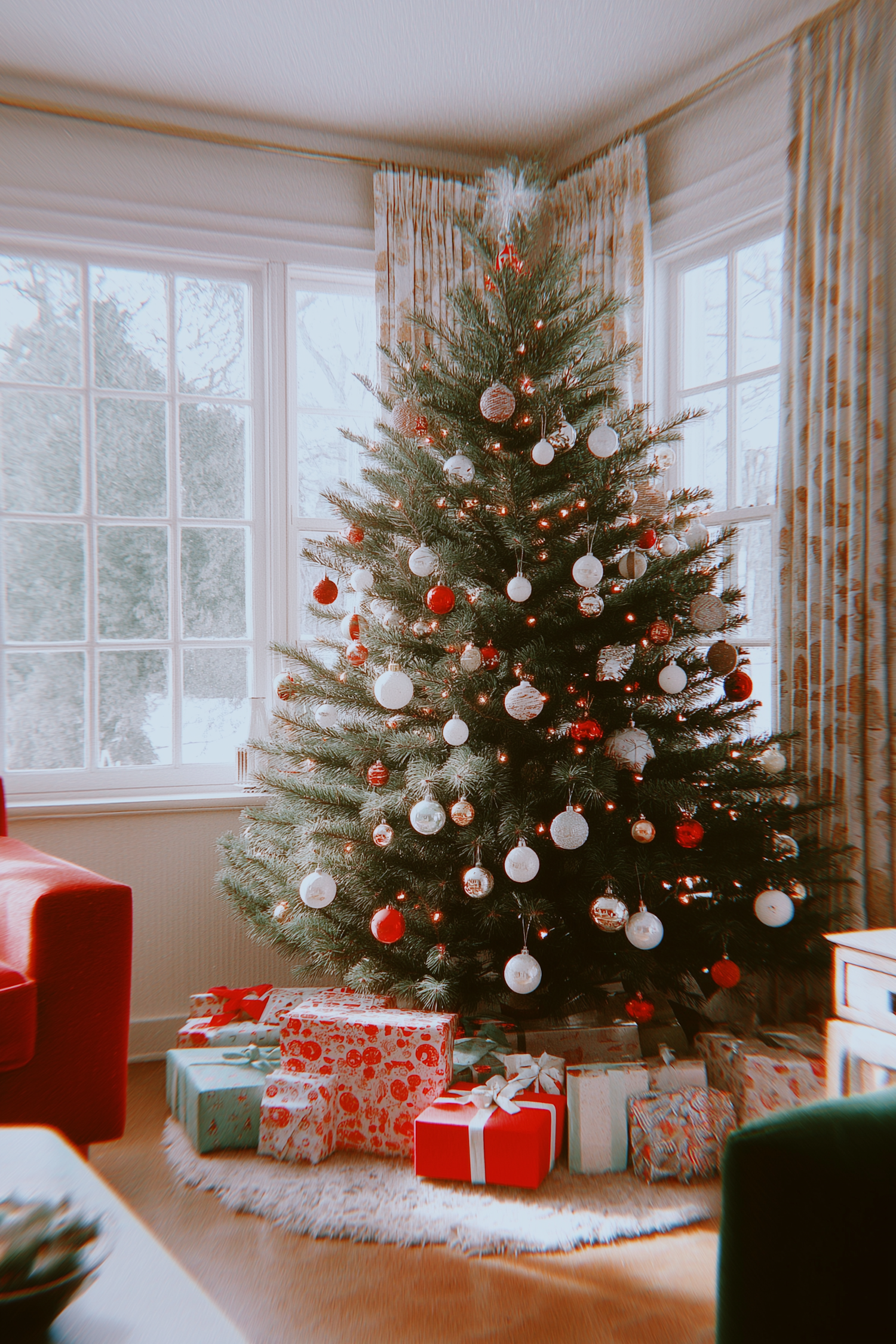 A festive Christmas tree with red and white ornaments, surrounded by wrapped gifts, in a cozy, naturally lit living room.