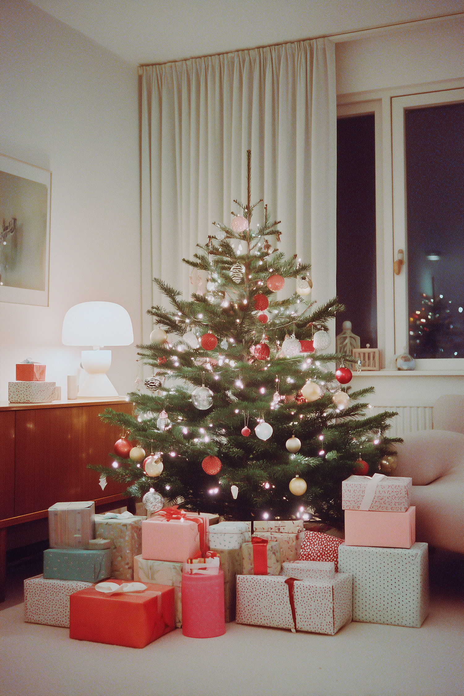 A festive Christmas tree with glowing lights and ornaments, surrounded by colorful presents in a cozy, warmly lit room.